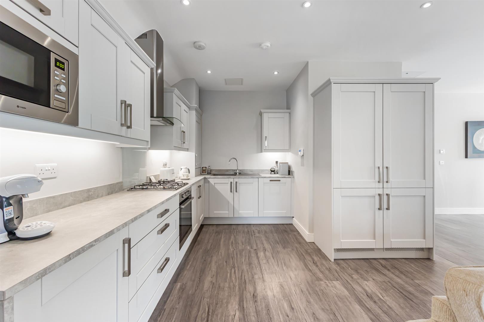 Excellent range of painted effect high and low level cupboards and drawers; formica worktops incorporating Franke single drainer compound sink unit with swan neck mixer tap; Indesit electric oven; Indesit 4 ring gas hob with stainless steel extractor unit and light over; integrated fridge; integrated freezer; integrated Indesit dishwasher; Logic combi gas fired boiler; Caple microwave; Karndean luxury flooring; LED spotlights; electric fire; tv aerial connection point; under eaves storage.