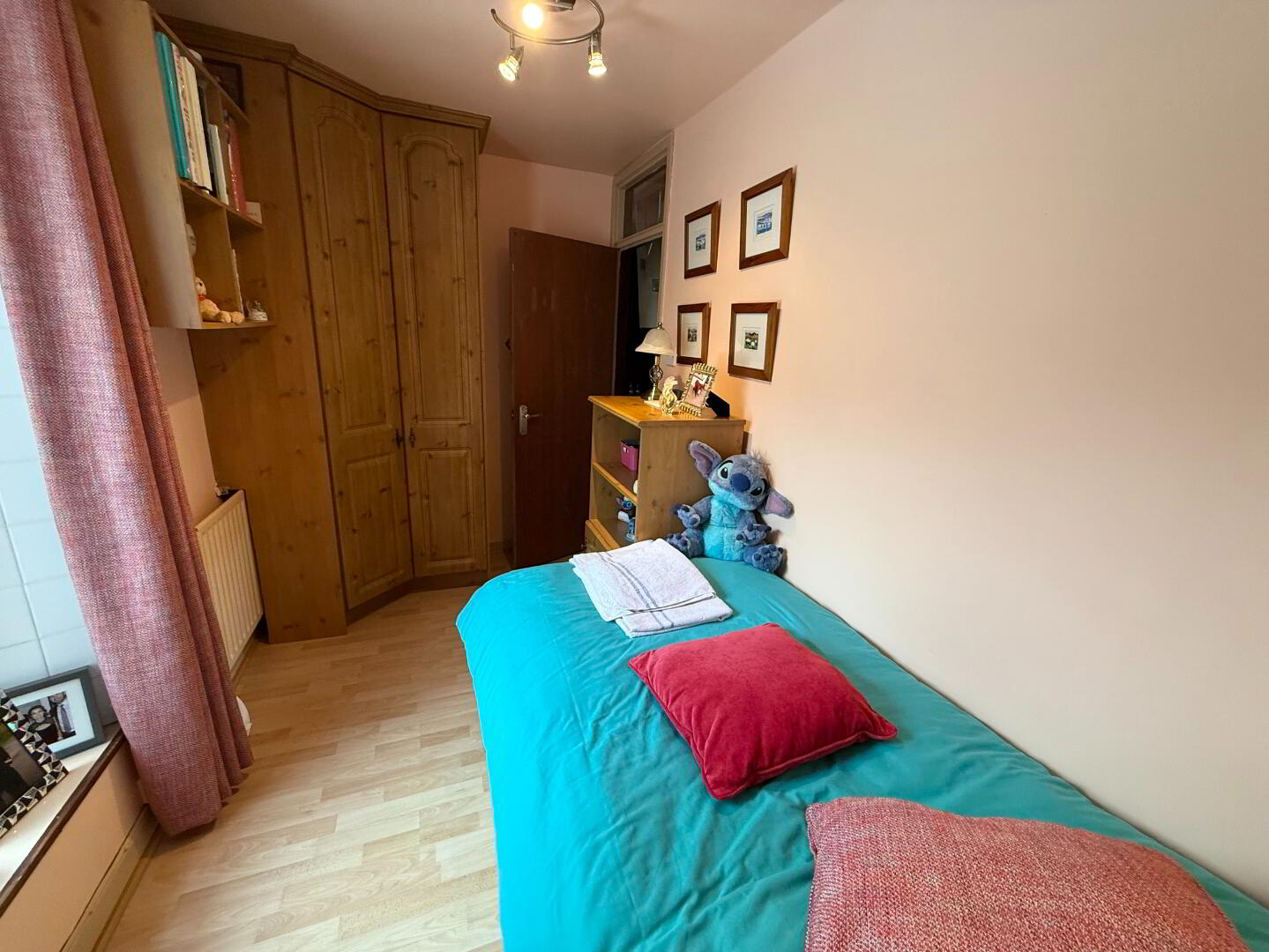 A generous second reception room, currently used as a living room, with an open fireplace and back boiler set in an attractive wooden surround. This mid-house space also includes wooden flooring, fitted units, TV points, and useful high-wall storage.