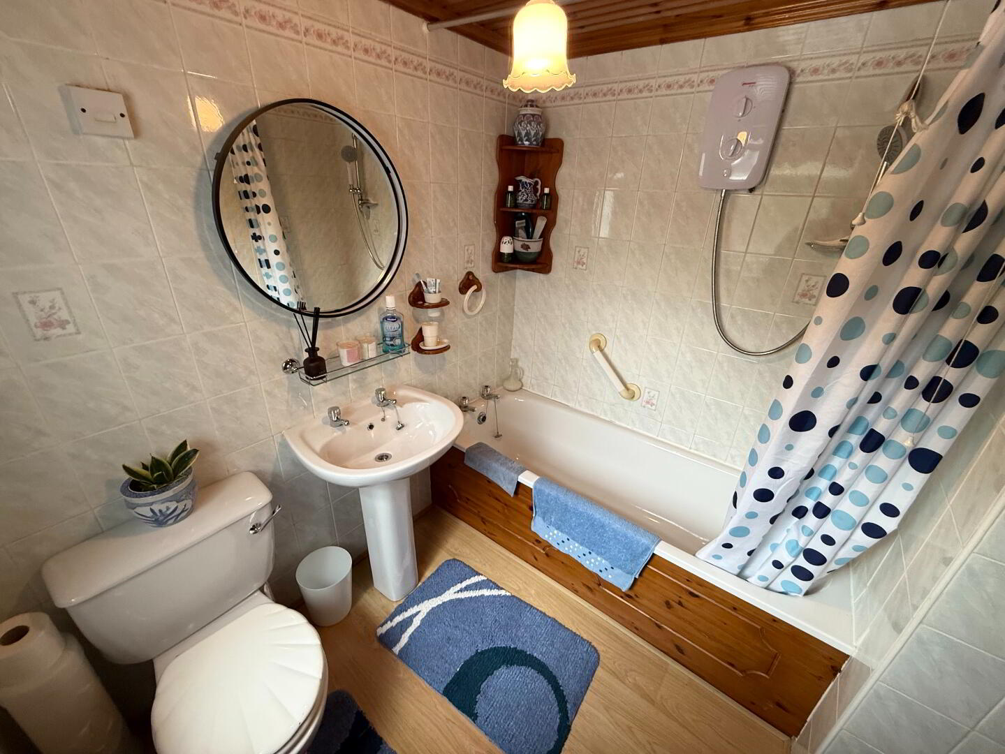 Spacious family bathroom with a four-piece suite comprising WC, wash hand basin, standalone sink, and bathtub with overhead electric shower. Finished with wooden flooring and ceiling, tiled walls and an electric mirror.