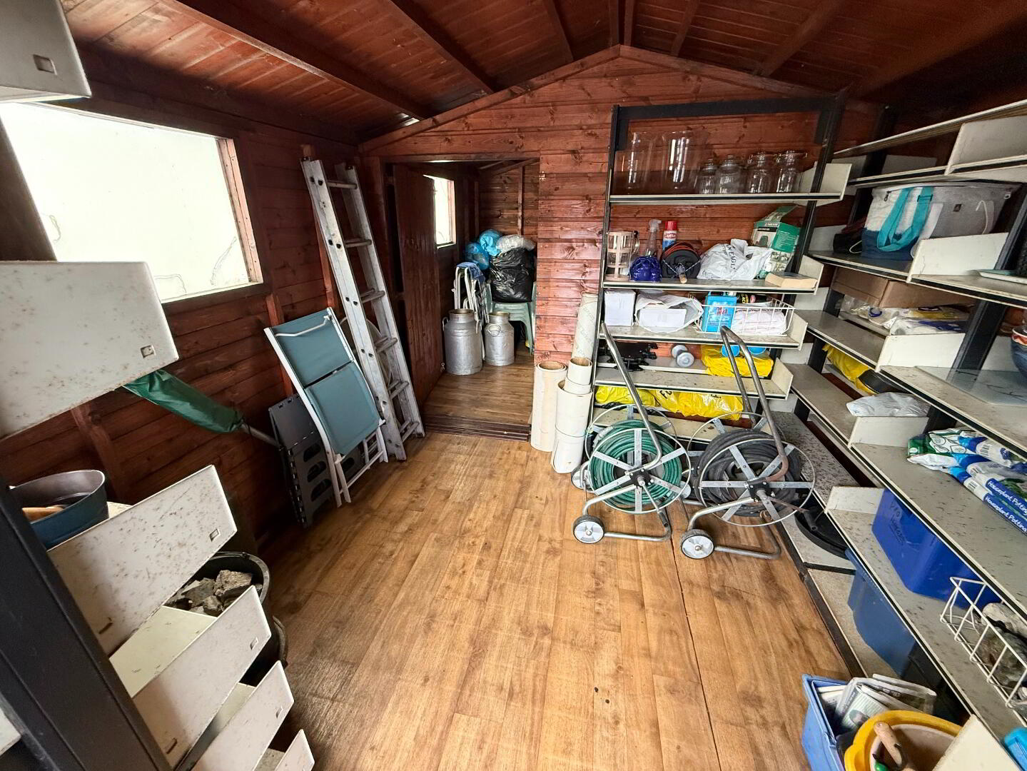 A bright and substantial outbuilding with concrete flooring and a mechanic’s pit, fully fitted with aluminium shelving and electricity. Two gated gardens sit on either side, adding valuable outdoor space and flexibility.