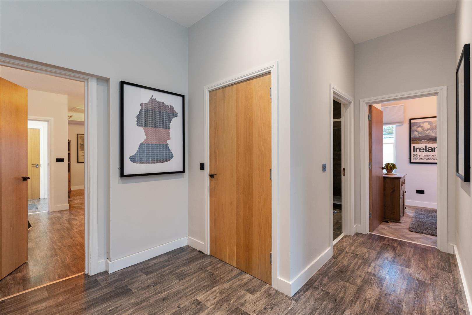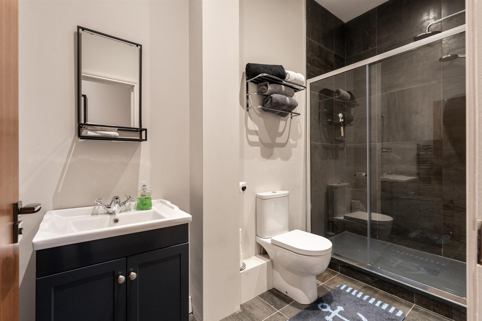 White suite comprising walk in shower enclosure with wall mounted overhead shower and sliding glass doors, vanity unit with mixer tap and storage, low flush w/c, heated towel rail, tiled floor, partially tiled walls, recessed spotlights, extractor fan.