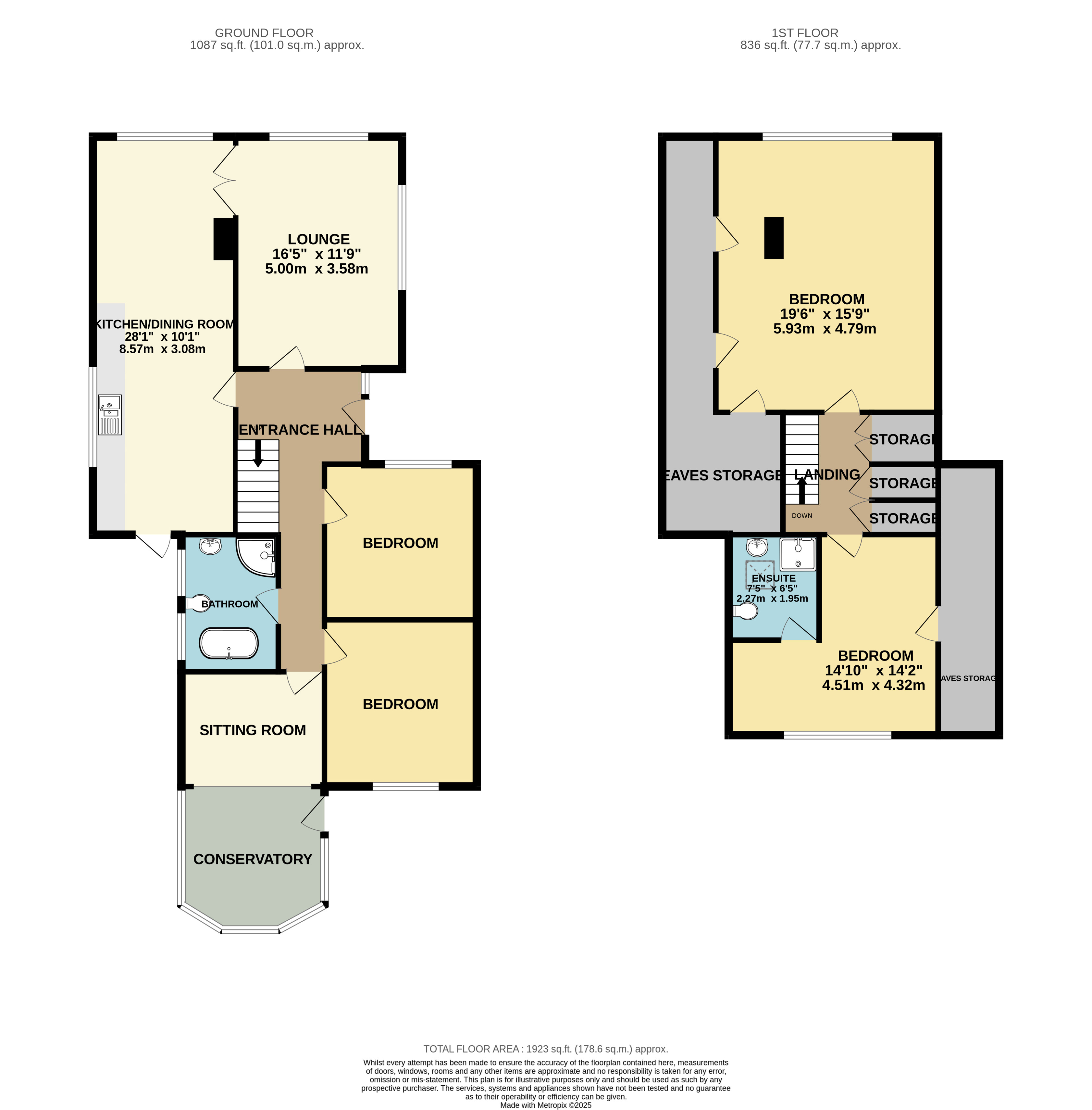 Upstairs, two further spacious double bedrooms provide comfortable accommodation, with one benefiting from an ensuite shower room. Storage is well catered for, with three built-in cupboards on the landing and easy access to eaves storage from both bedrooms.