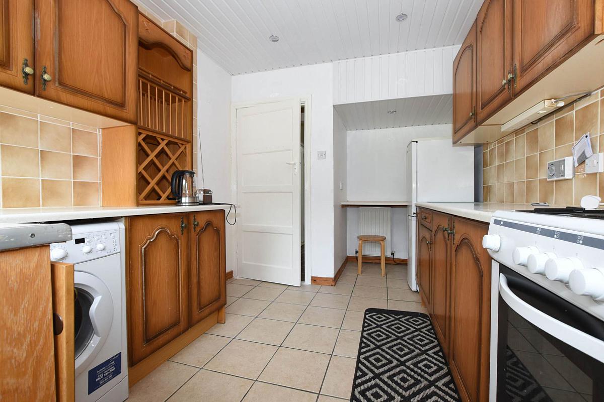 Single drainer sink unit. Range of fitted high low level kitchen units with roll edged work tops. Part wall tiling. Ceramic tiled floor