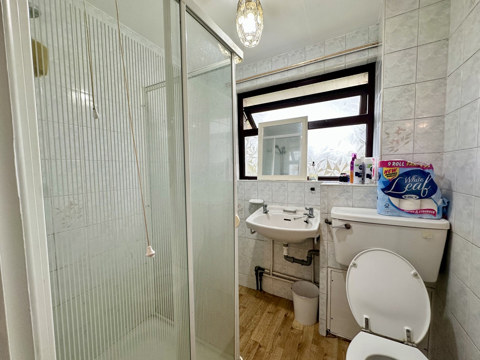 Bathroom 6'1" X 3'10" (1.86m X 1.17m) Laminate flooring, tiled walls, corner shower, wall hung sink.