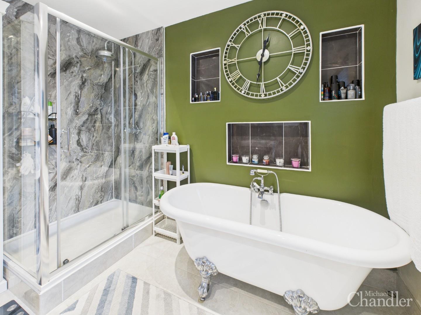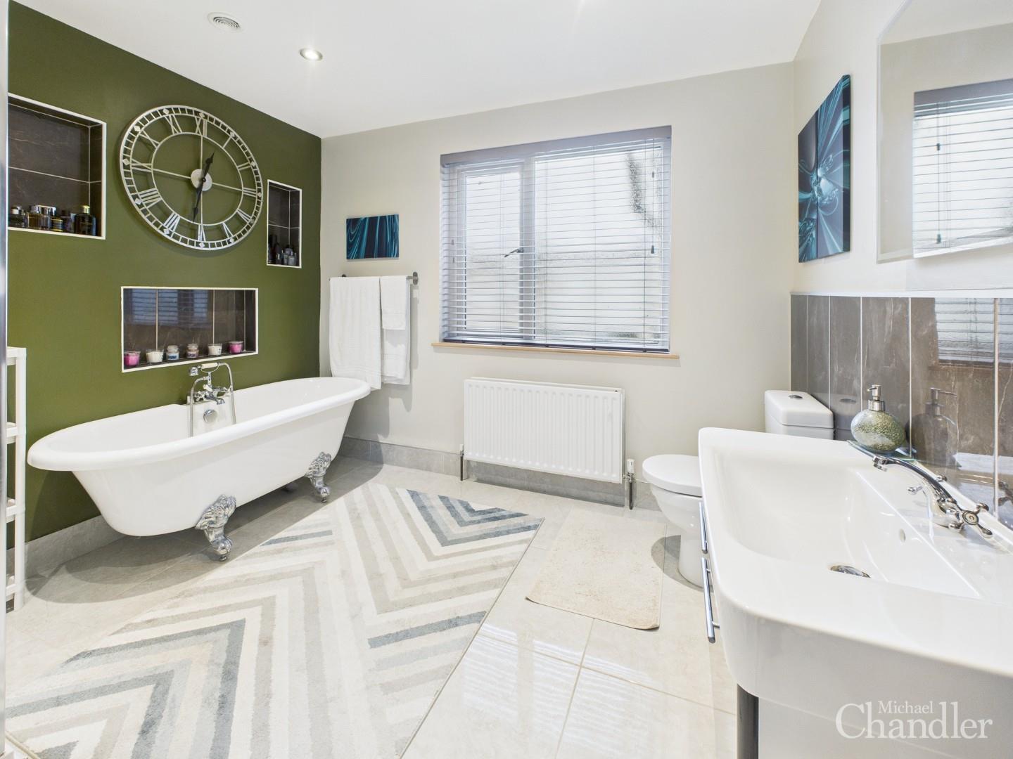 The main home welcomes you with a bright, spacious lounge featuring dual-aspect windows and a charming feature fireplace. The modern kitchen and dining area are beautifully presented, with a separate utility room for added convenience. On the ground floor are three well-proportioned bedrooms, including one with a stylish en-suite, a cosy snug/reception room, and a contemporary four-piece family bathroom with a freestanding roll-top bath and a walk-in shower. Upstairs, two generous king-size bedrooms both benefit from private en-suites.