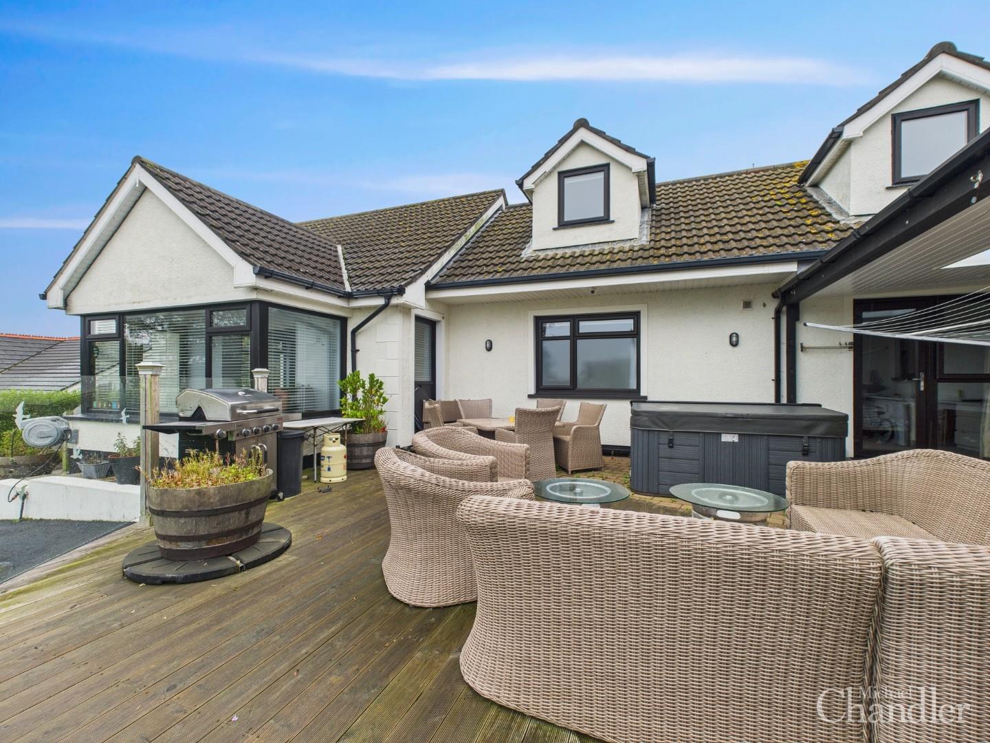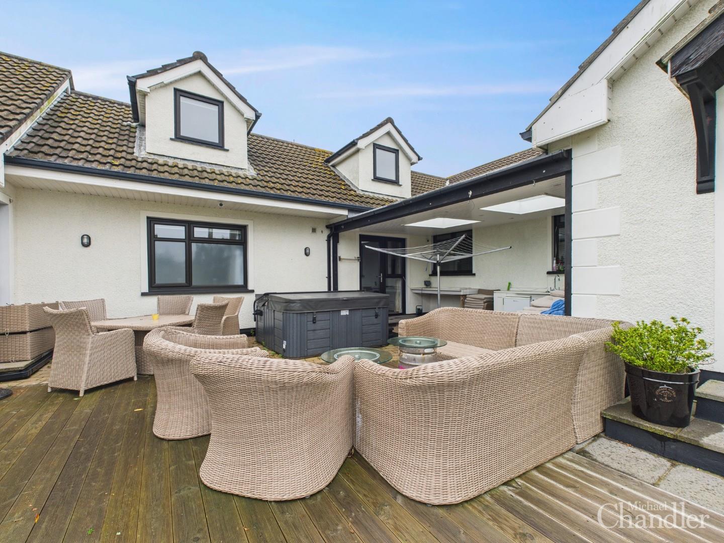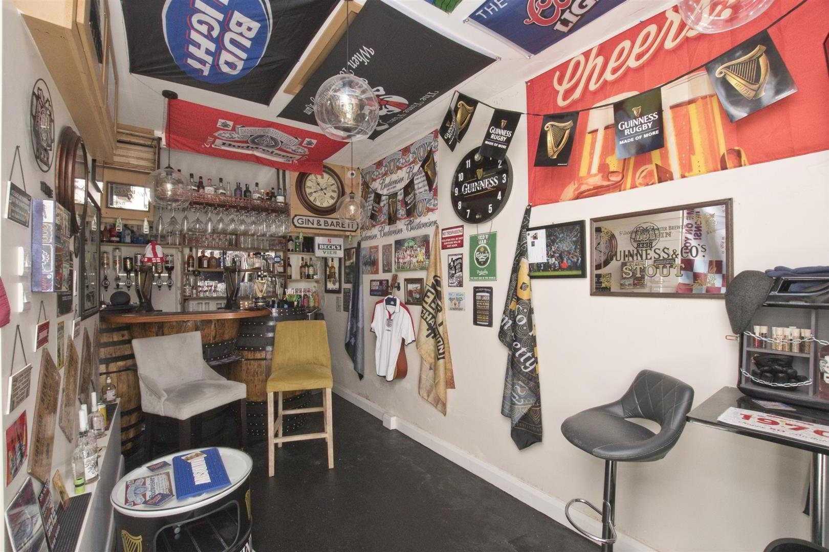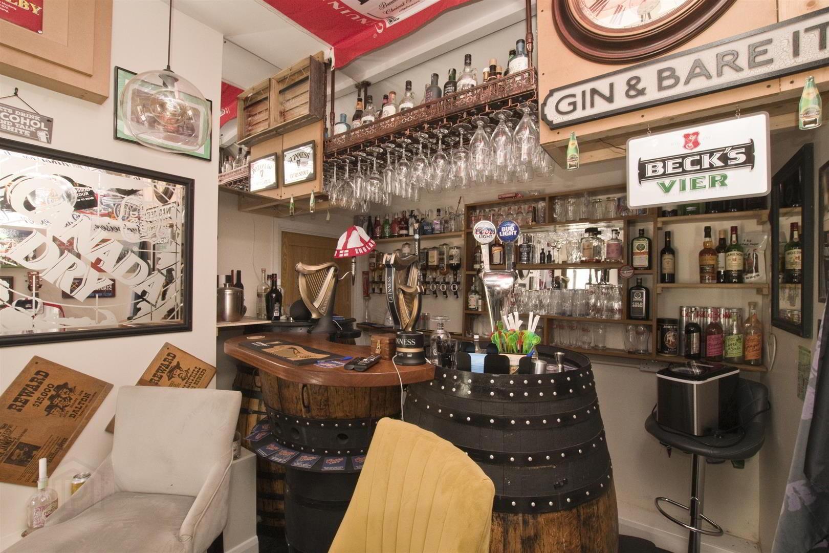 Externally, the property sits on a generous plot with a large driveway providing ample off-road parking, beautifully landscaped gardens with mature shrubs, and multiple patio seating areas including a raised, covered decking space. A standout feature is the fantastic outdoor bar with WC and workshop/store room, perfect for entertaining or creating your own private retreat.