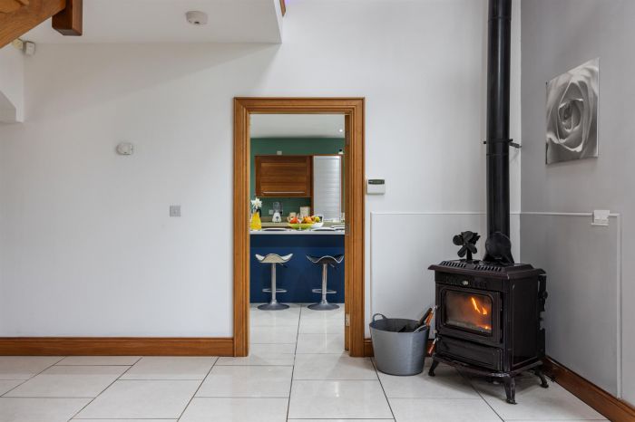 UPVC front door with side panels and fan light, leading to reception hall. Tiled flooring, wood burning stove. oak staircase leading to first floor and gallery landing.