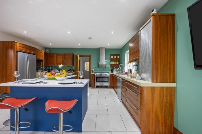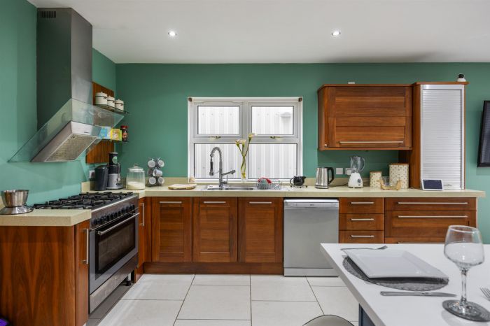Extensive range of high and low level units incorporating stainless steel bowl and a half, space for range style hob, integrated microwave oven, stainless steel extractor fan, space for American style fridge/freezer, plumbed for dishwasher, 'L' shaped island unit/dining area, tiled flooring. Door to utility room.