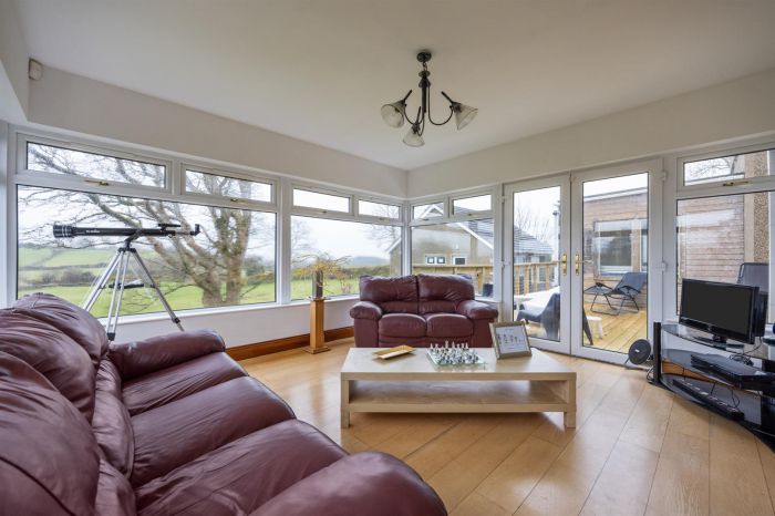 Sunroom with views over surrounding countryside. Wood flooring, double doors to decked patio area.
