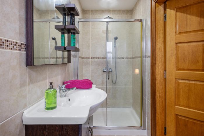 White suite incorporating shower unit, wash hand basin and low flush wc.