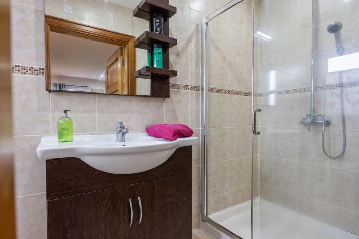 White suite comprising built in shower, wash hand basin with built in vanity unit, low flush wc, fully tiled walls and tiled flooring.