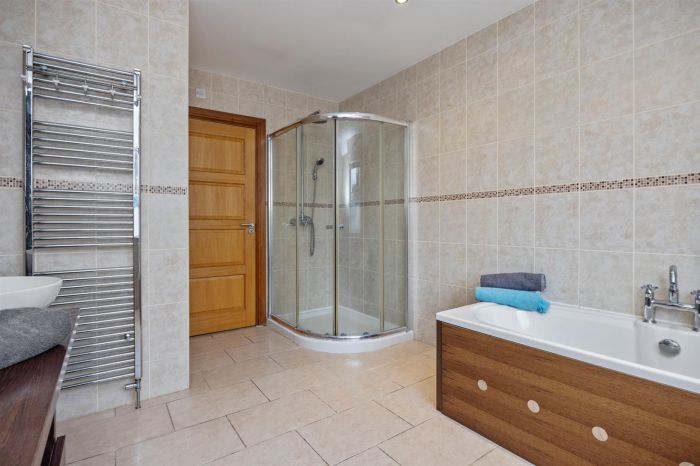 White suite comprising panelled bath, low flush wc, large corner shower, dual basin vanity unit, stainless steel heated towel rail, fully tiled walls, tiled flooring.