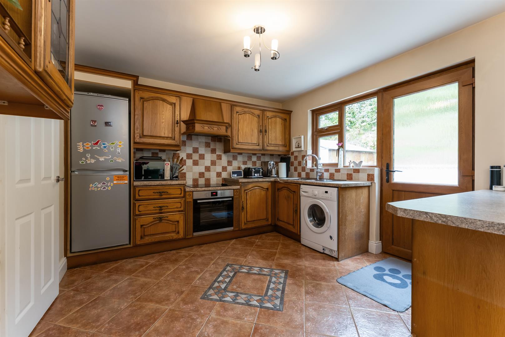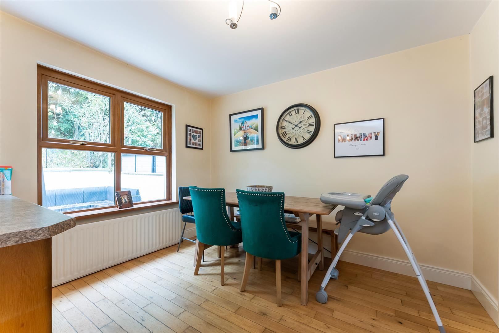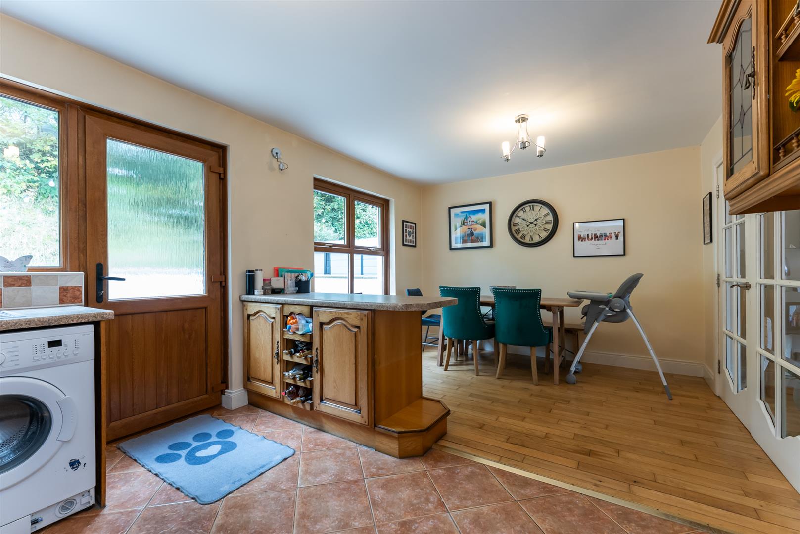 A range of high and low level units including stainless steel sink unit, space for washing machine and fridge freezer. Integrated oven and hob. Tiled floor in kitchen and wooden flooring in dining area. Door to rear.