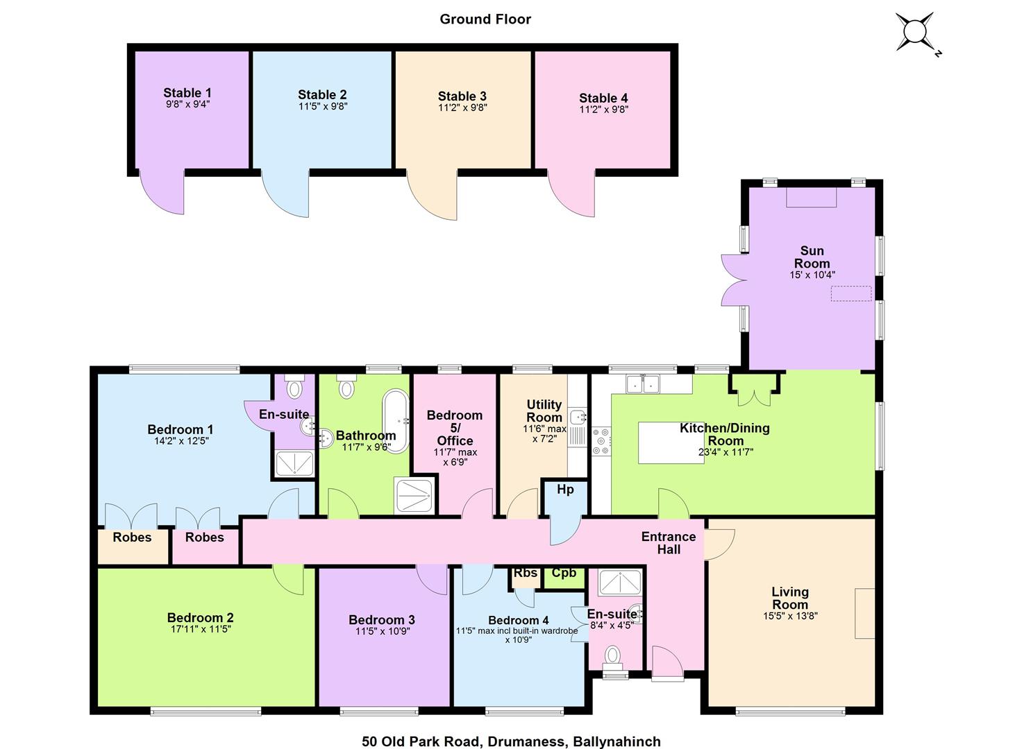 Approached by a private lane and conveniently accessed from the Old Park Road, the home is set in a serene environment, This idyllic location provides a perfect backdrop for leisurely walks and outdoor activities. The property boasts wrap-around mature gardens with featured patio, complete with a charming pergola that enhances its appeal. Additionally, the property includes four stables, which present a fantastic opportunity for equestrian enthusiasts or could be repurposed for a variety of uses, such as a workshop or additional storage space.