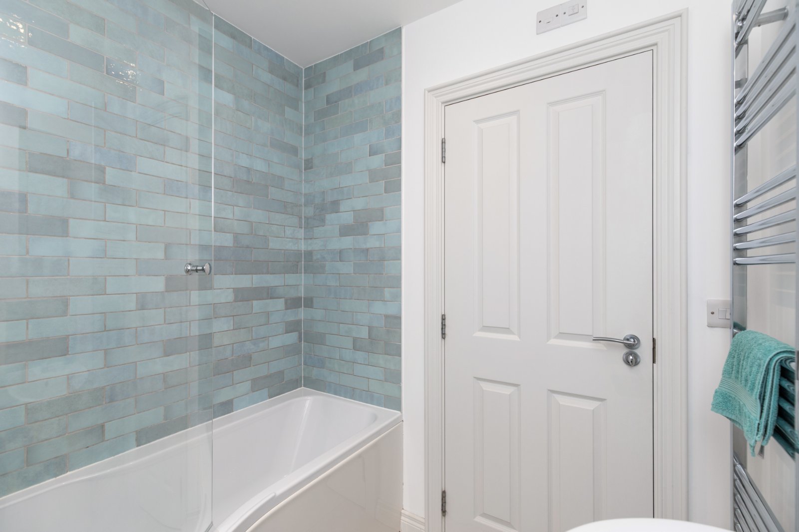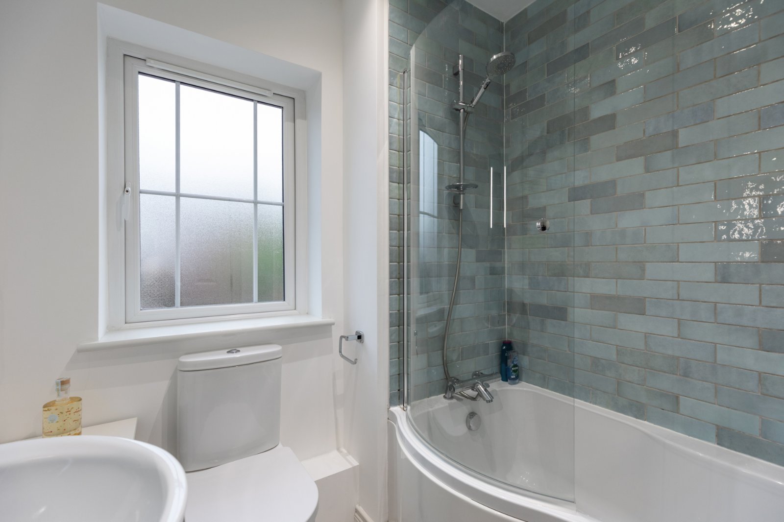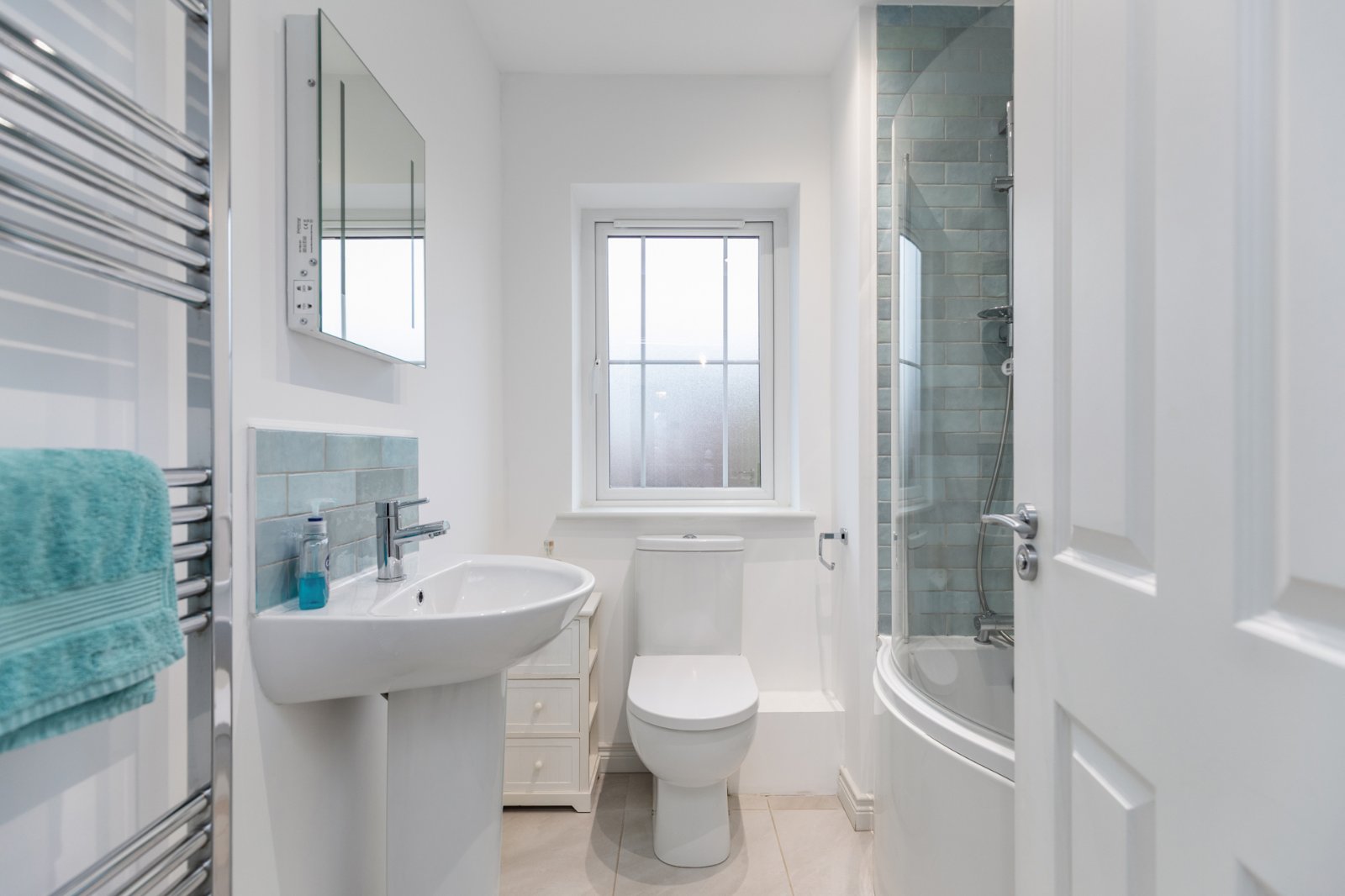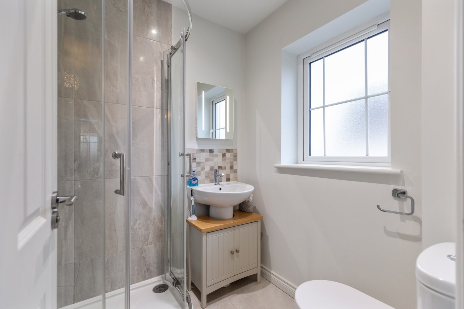 Fully tiled shower cubicle with thermostatic shower, pedestal wash hand basin with mixer taps, low flush WC, ceramic tiled floor, chrome towel radiator.