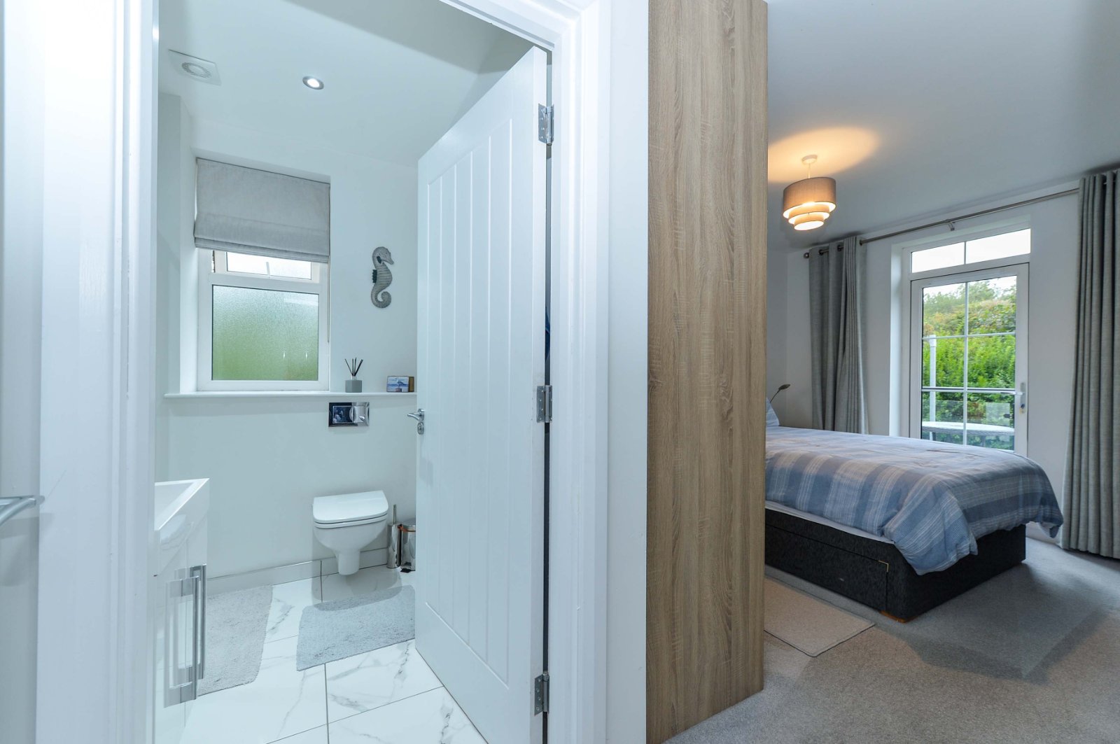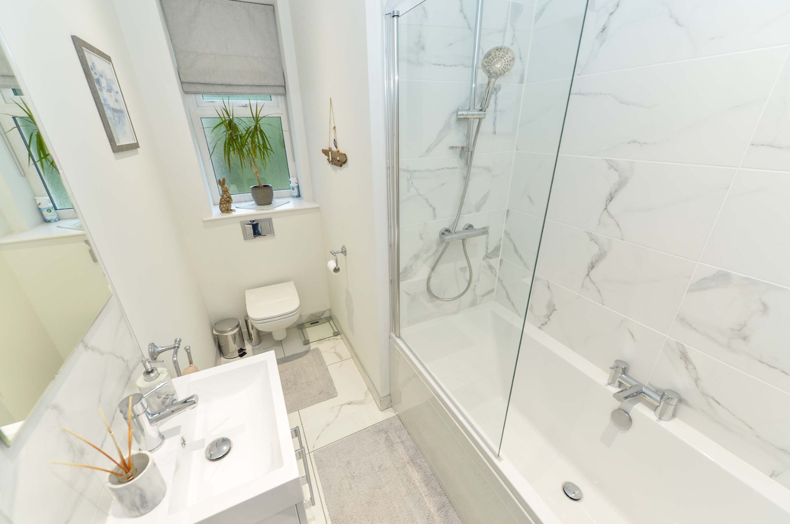 Modern white suite, fully tiled built in shower cubicle with thermostatically controlled shower, dual flush close coupled WC, vanity unit with mixer taps and tiled splash back, ceramic tiled floor, chrome heated towel rail, recessed spotlights.