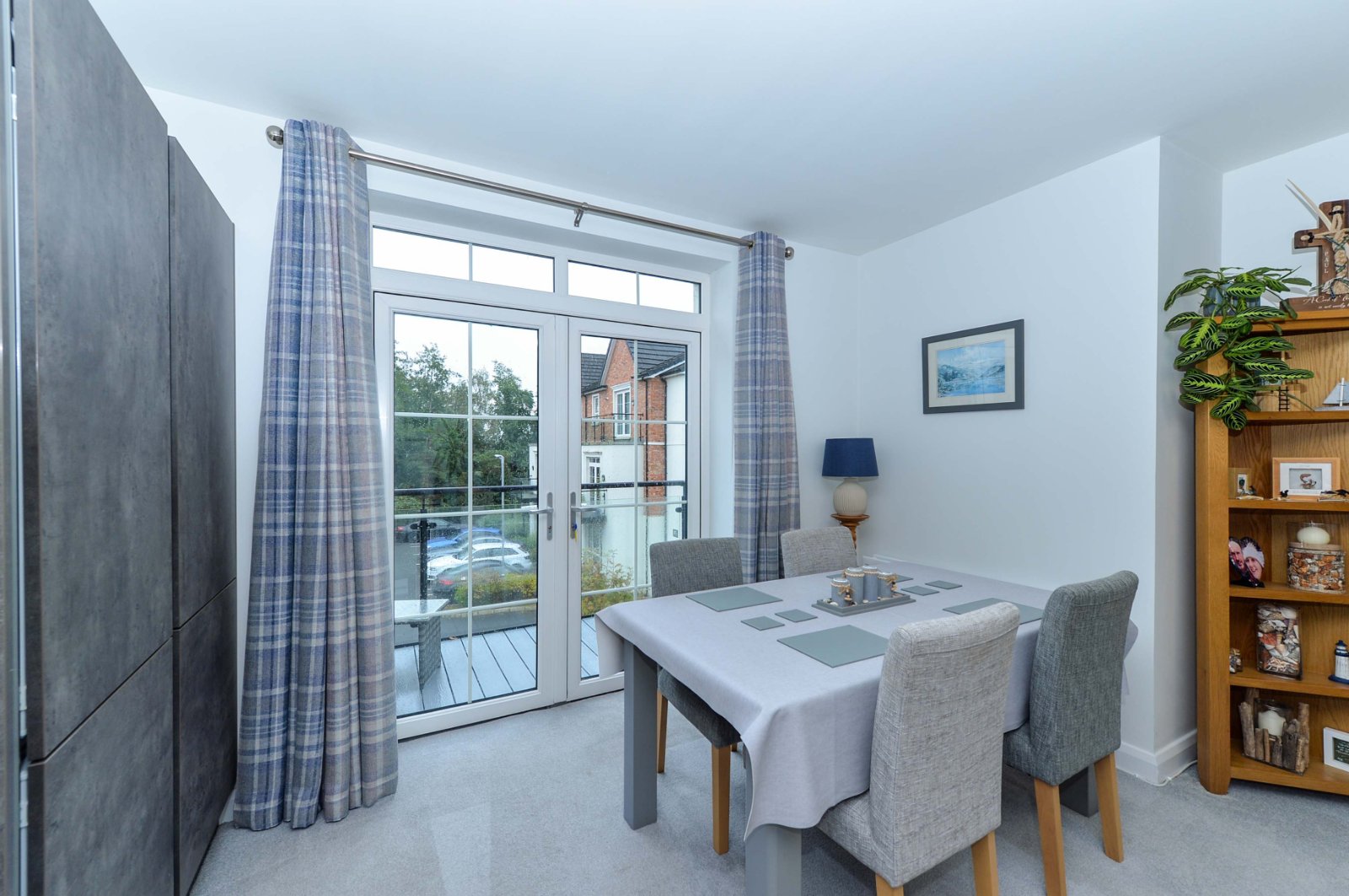Dual aspect, ample dining area, double glazed French doors to balcony with composite deck and glass balustrade.