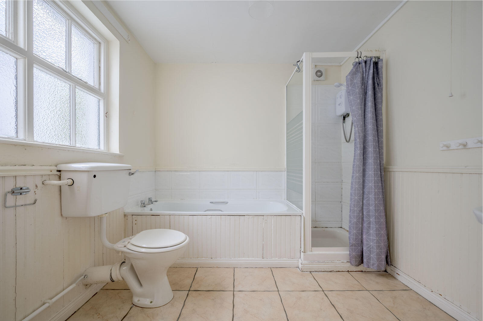 With white suite comprising panelled bath, chrome taps, tiled splashback, separate shower cubicle with electric shower, pedestal wash hand basin, low flush WC, tiled floors.
