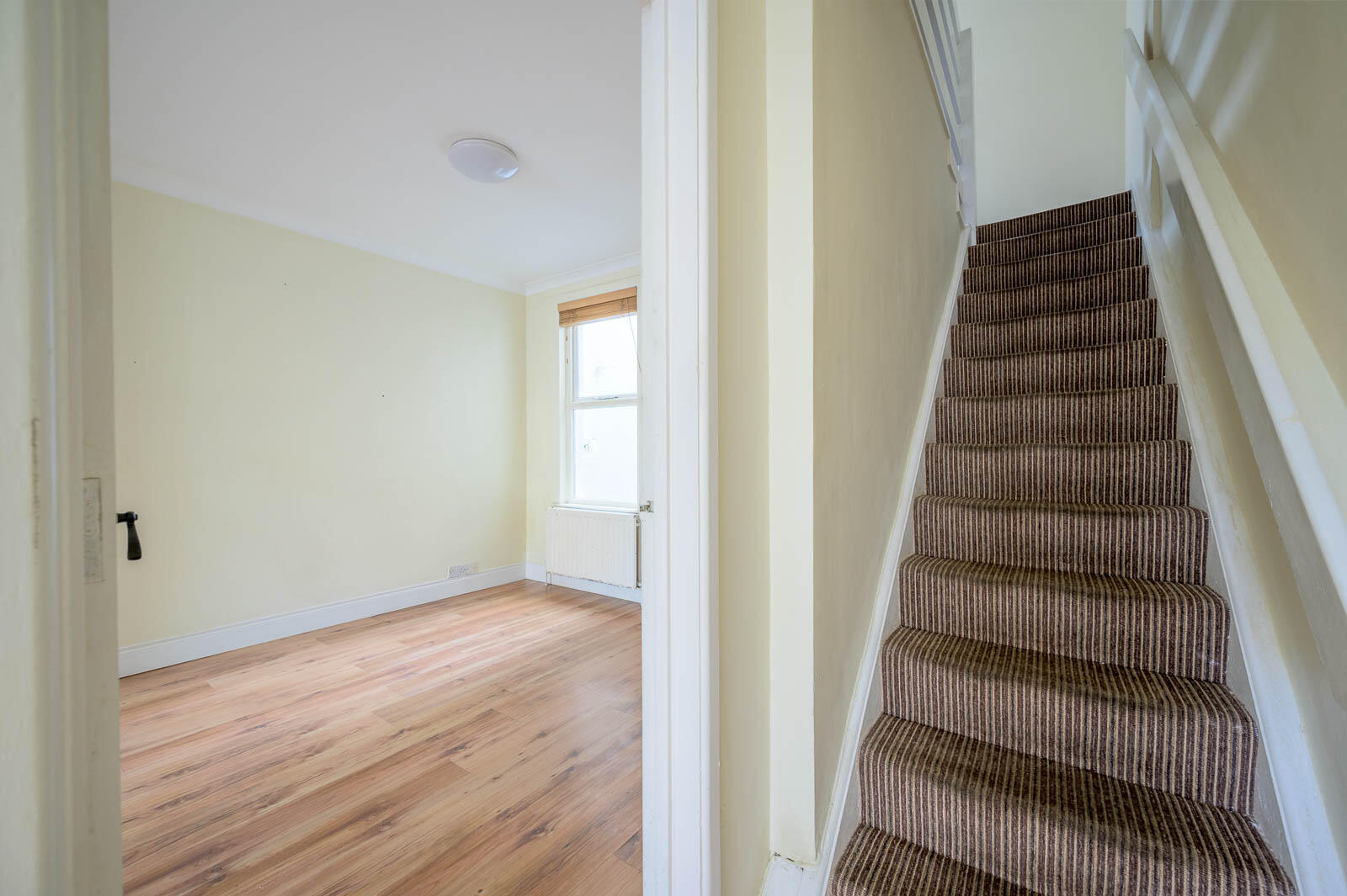 With wood laminate flooring and corniced ceiling.