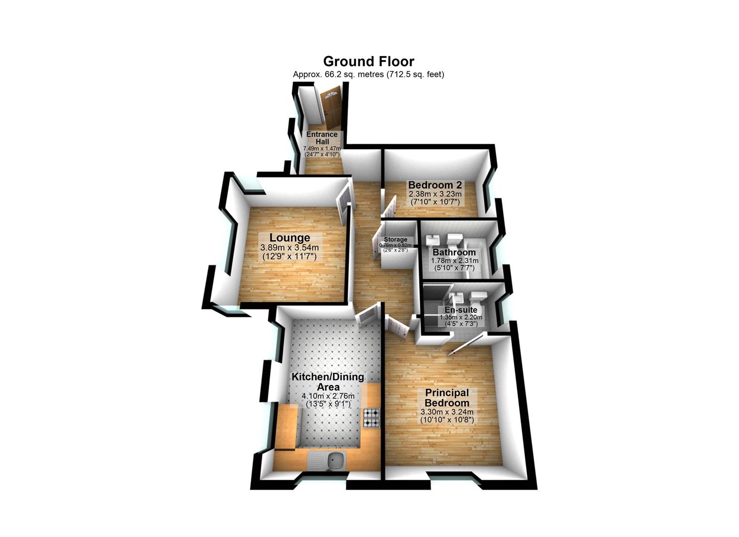 En Suite Shower Room 7'3 X 4'5 (2.21m X 1.35m) White suite comprising of close coupled WC, wall hung wash hand basin, waterfall mixer tap, vanity storage below, thermostatically controlled shower, telephone handle attachment, drencher above, tiled shower cubicle, tiled floor.