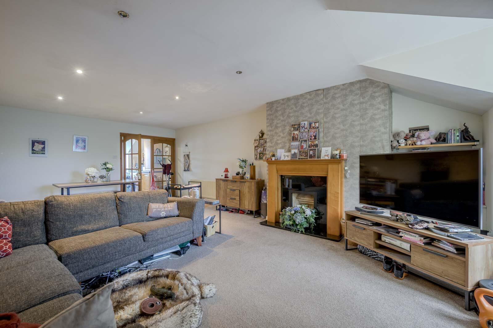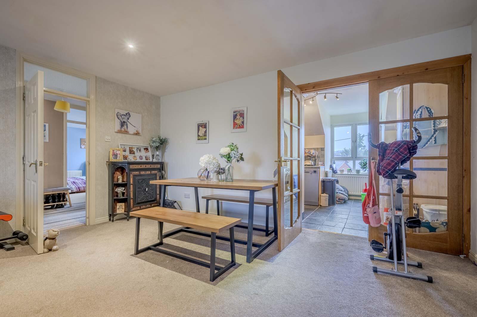With feature fireplace and gas fire, French doors leading to kitchen.