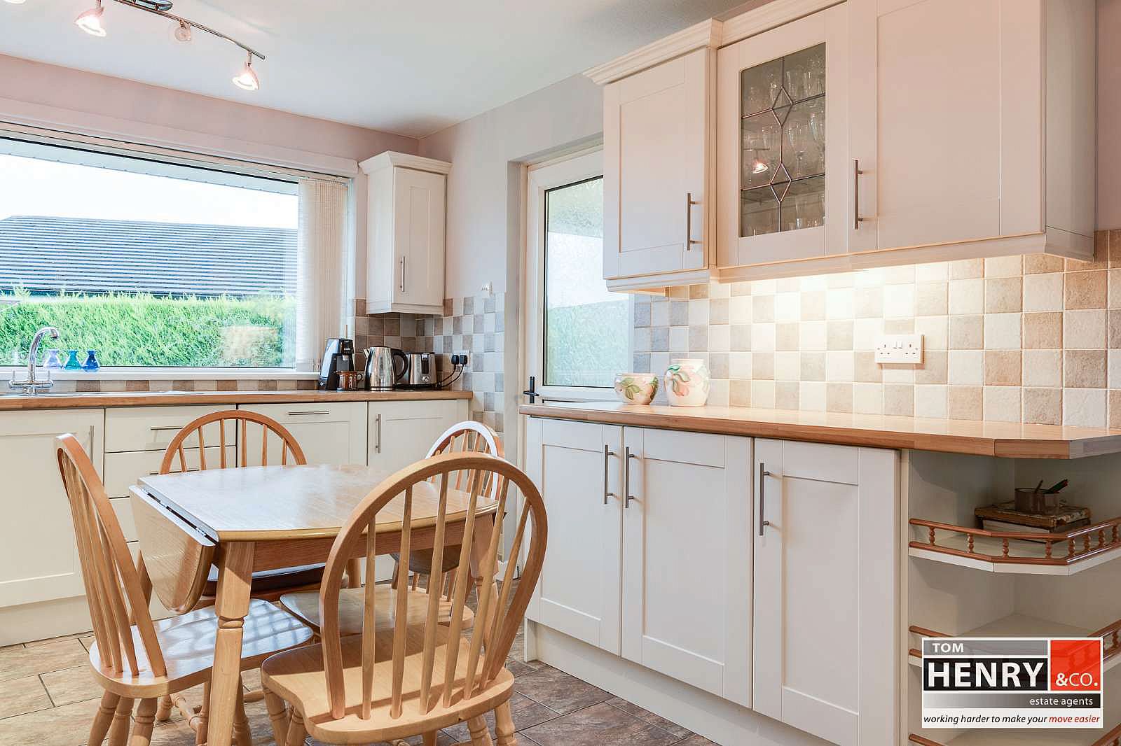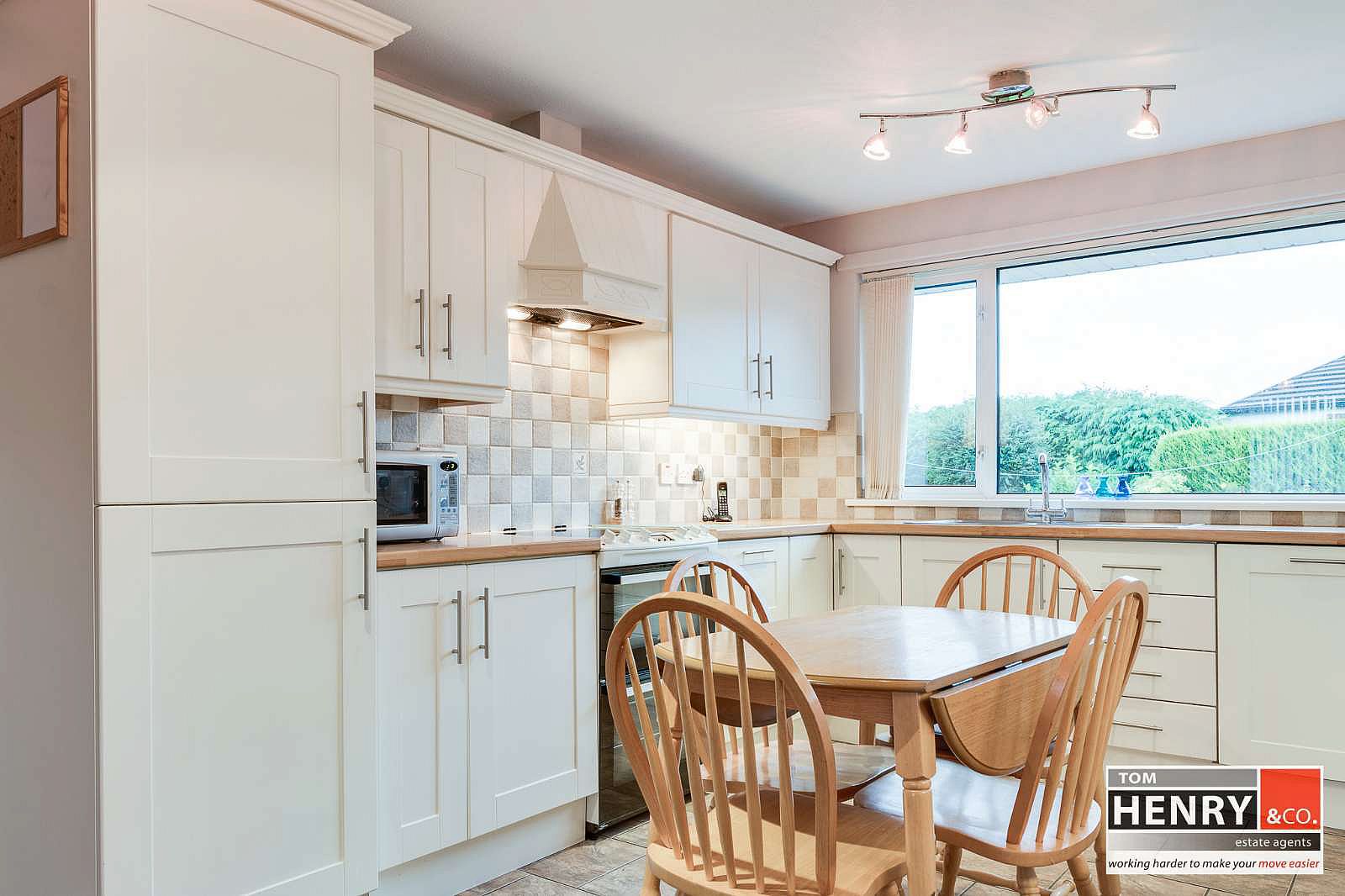 FITTED HIGH & LOW LEVEL UNITS WITH UNDER UNIT LIGHTING. ILLUMINATED LEADED GLAZED DISPLAY UNIT. S.S. SINK & DRAINER WITH MIXER TAP FITTING. SPACE FOR COOKER (INCLUDED) WITH X-FAN OVER. INTEGRATED FRIDGE FREEZER. INTEGRATED DISHWASHER. TILED BETWEEN UNITS. TILED FLOOR. U.P.V.C DOOR WITH GLASS PANEL TO REAR LOBBY. ACCESS TO FAMILY ROOM / SUNROOM. PART GLAZED DOOR TO FORMAL DINING ROOM.