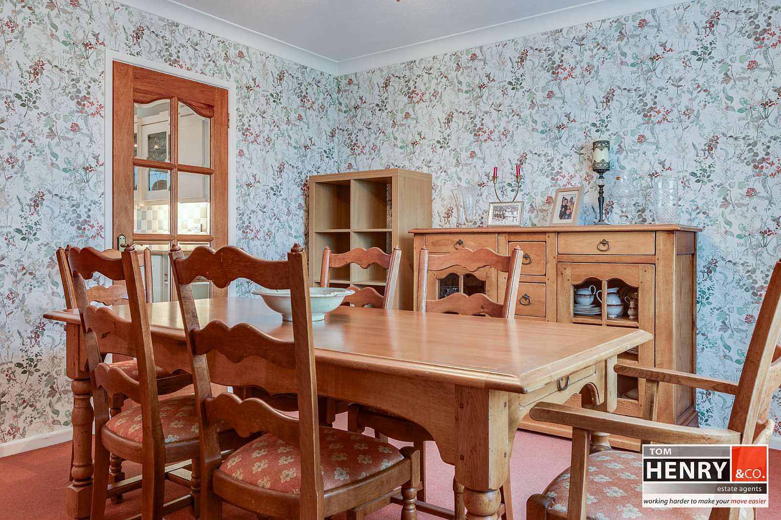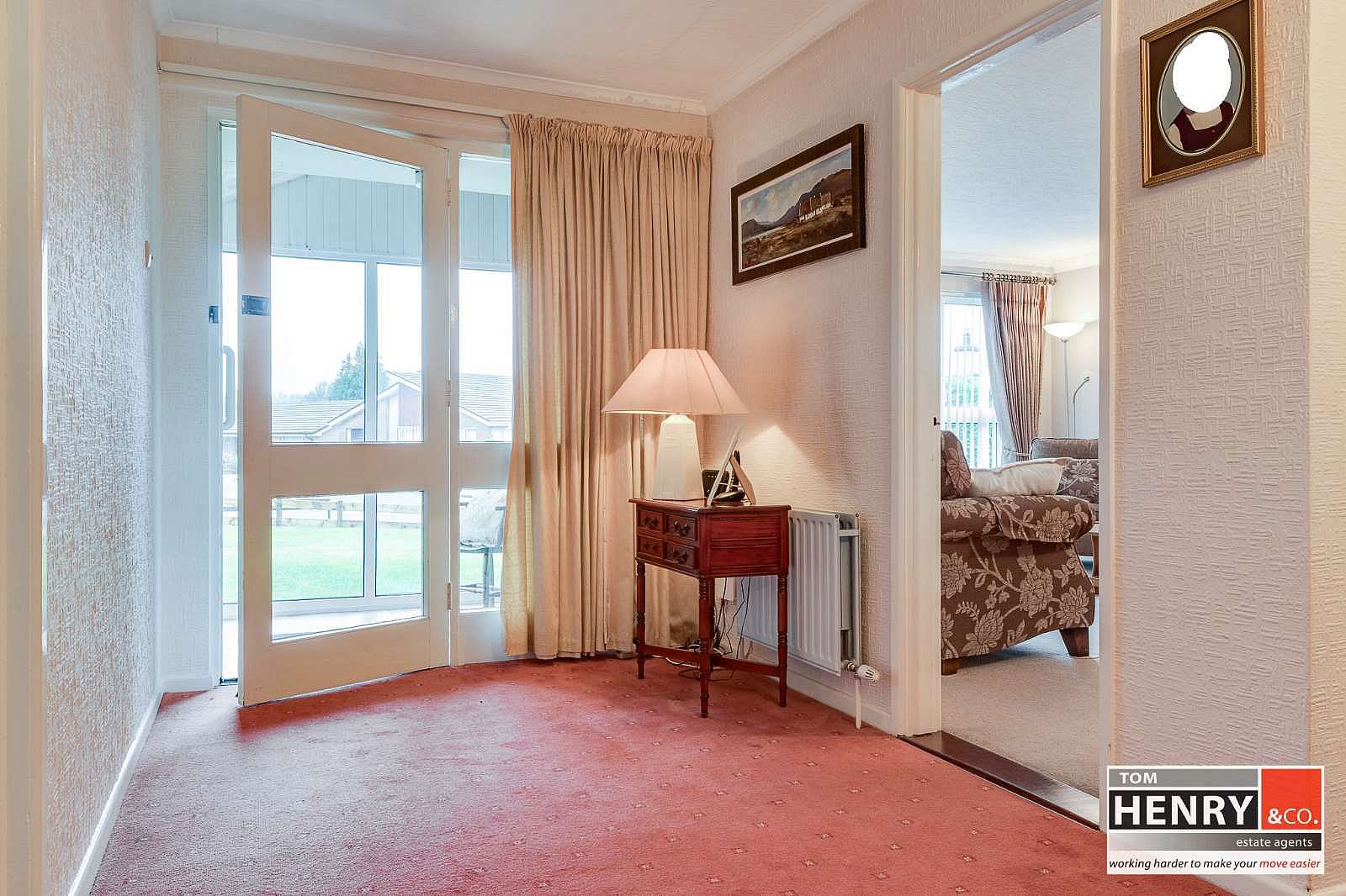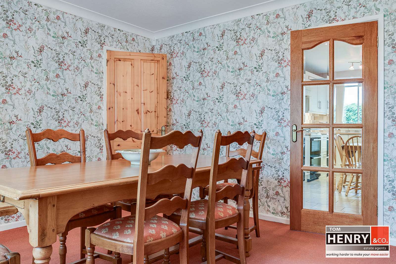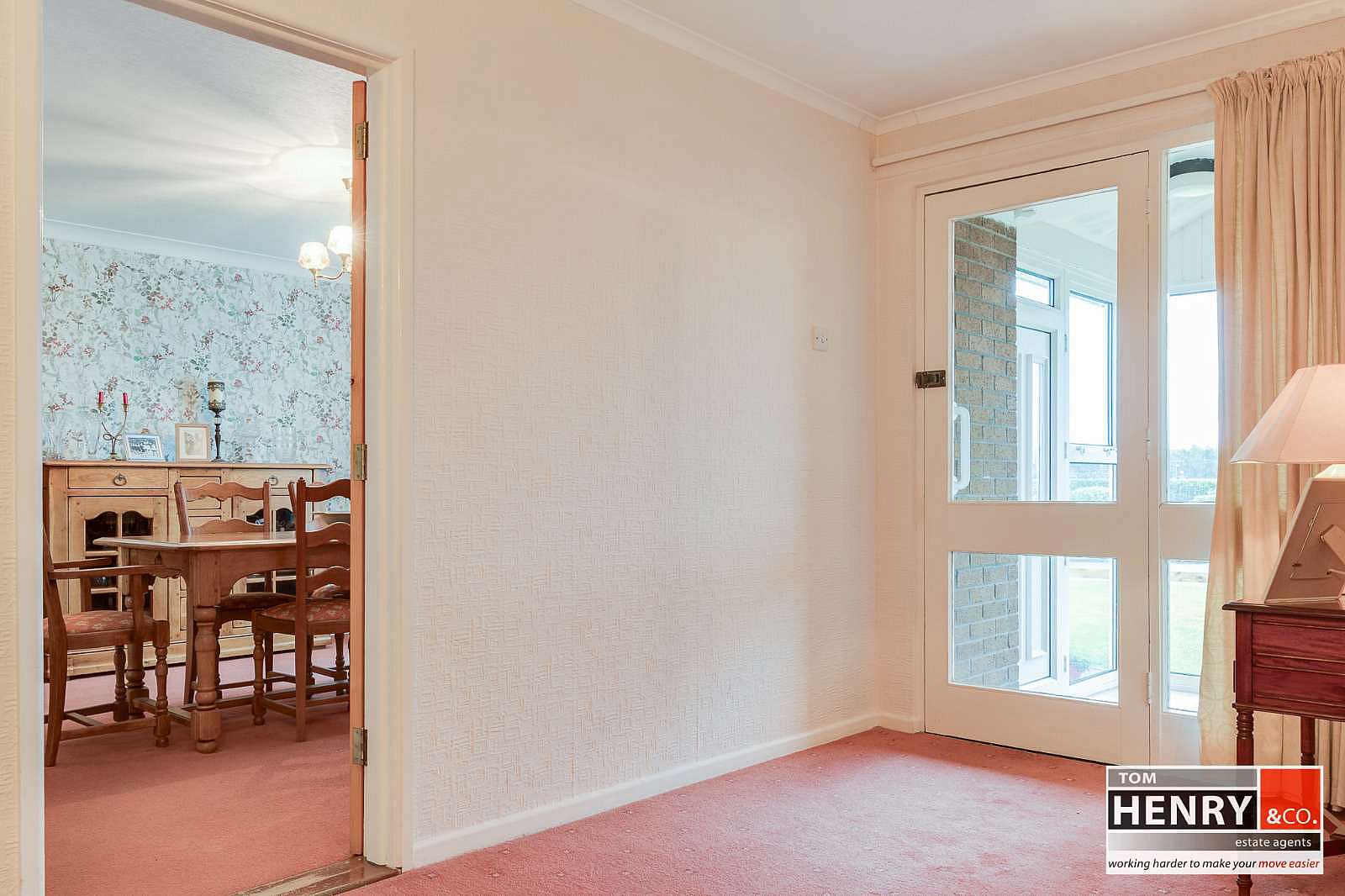 PART GLAZED DOOR FROM KITCHEN, CARPET TO FLOOR. COVING TO CEILING.