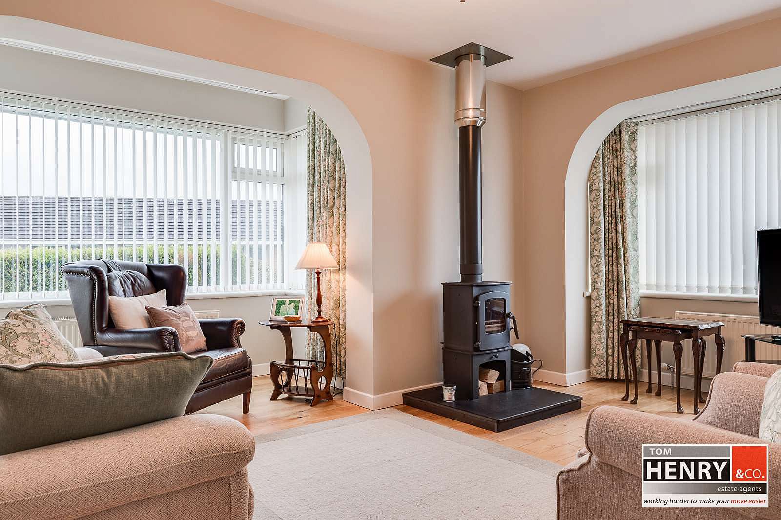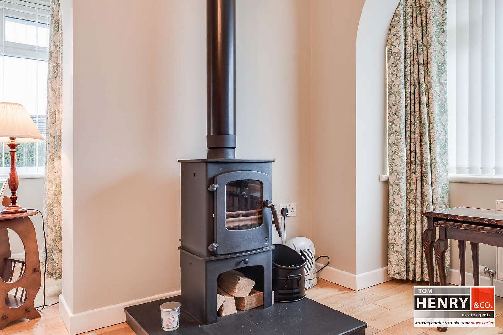 DUAL ASPECT BAY WINDOWS. GLASS FRONTED STOVE. PRE-FINISHED FLOOR. P.V.C. EXTERNAL DOOR WITH GLAZED PANELS TO SIDE GARDEN.