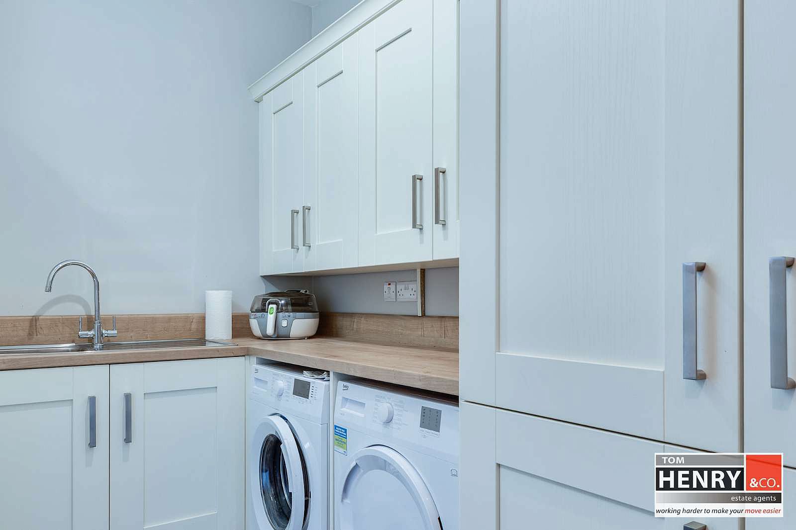 FITTED HIGH & LOW LEVEL UNITS. S.S. SINK & DRAINER WITH MIXER TAP FITTING. PLUMBED FOR A.W.M. SPACE FOR TUMBLE DRYER. PRE-FINISHED FLOOR. ACCESS TO ROOF SPACE VIA A PULL DOWN LADDER; FLOORED FOR STORAGE.