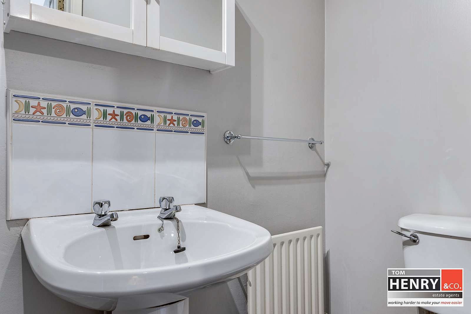 WASH HAND BASIN WITH TILED SPLASH BACK. TOILET.