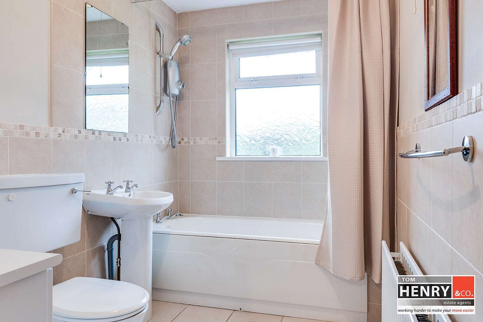 WASH HAND BASIN. BATH WITH SHOWER OVER. TOILET. PART TILED WALLS. TILED FLOOR.