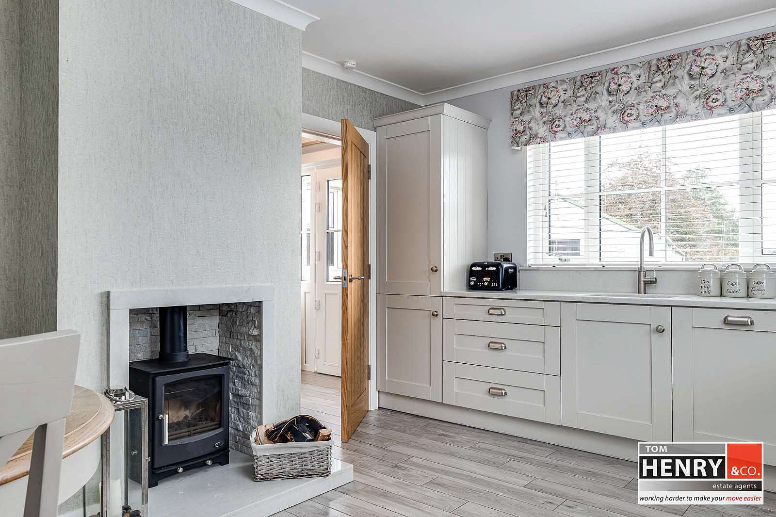 FITTED UNITS WITH QUARTZ WORKTOP & UPSTAND. “QUOOKER TAP” IN S.S. SINK WITH QUARTZ DRAINER. INTEGRATED HOB WITH X-FAN OVER IN S.S. CANOPY WITH QUARTZ SPLASH BACK. INTEGRATED UNDER OVEN. INTEGRATED FRIDGE FREEZER. LARDER TYPE UNIT. GLASS FRONTED WOOD BURNING STOVE IN TILED INGLENOOK WITH QUARTZ HEARTH & SURROUND. TILED FLOOR. COVING TO CEILING.