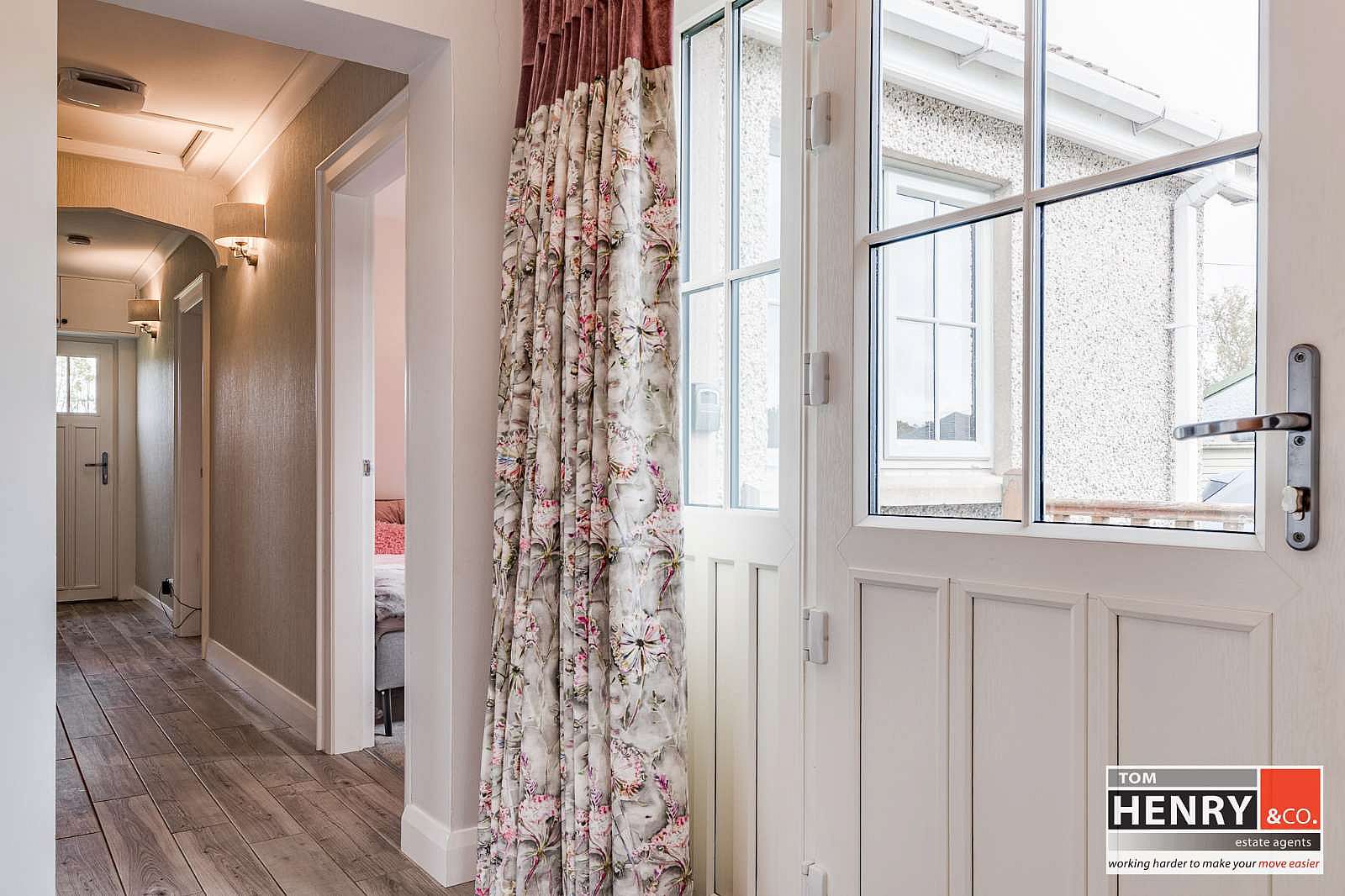 TILED FLOOR. COVING TO CEILING. P.V.C. EXTERNAL DOOR WITH GLAZED TOP PANEL & SIDE PANEL.
