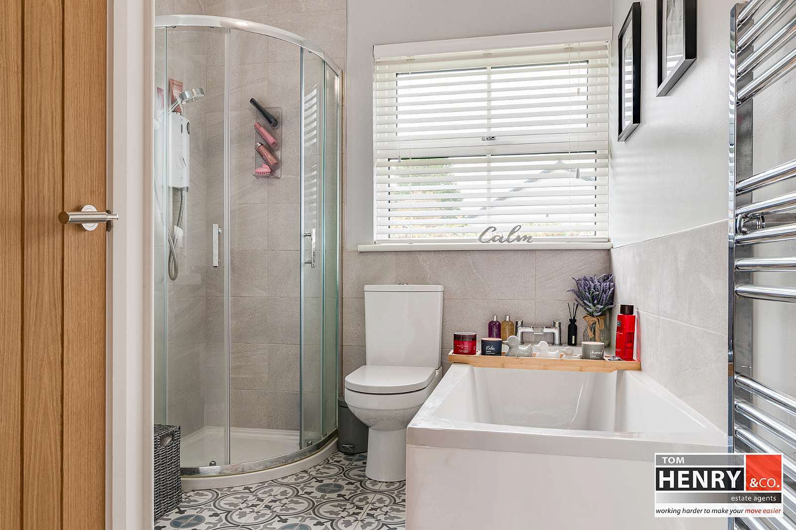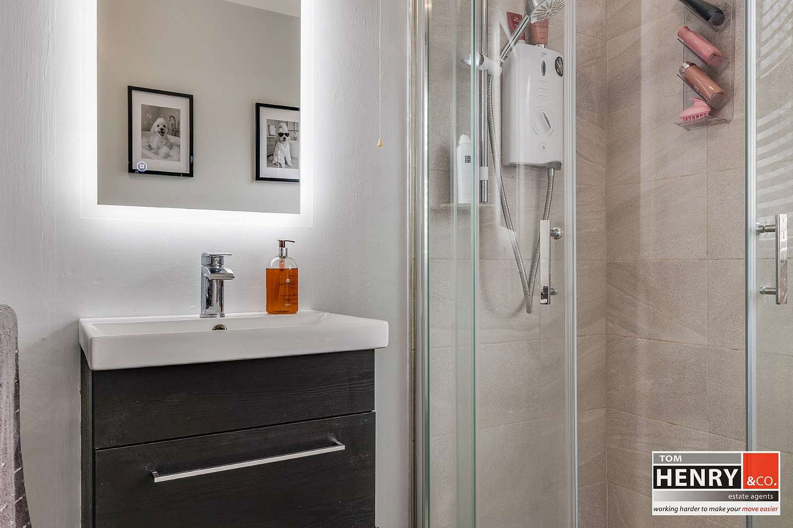 BATH WITH MIXER TAP FITTING. FULLY TILED “MIRA SPORT” ELECTRIC SHOWER. WASH HAND BASIN IN VANITY UNIT WITH MIXER TAP FITTING & ILLUMINATED MIRROR OVER. TOILET. HEATED TOWEL RAIL. SOME WALL TILING. TILED FLOOR. X-FAN. HOTPRESS: SHELVED.