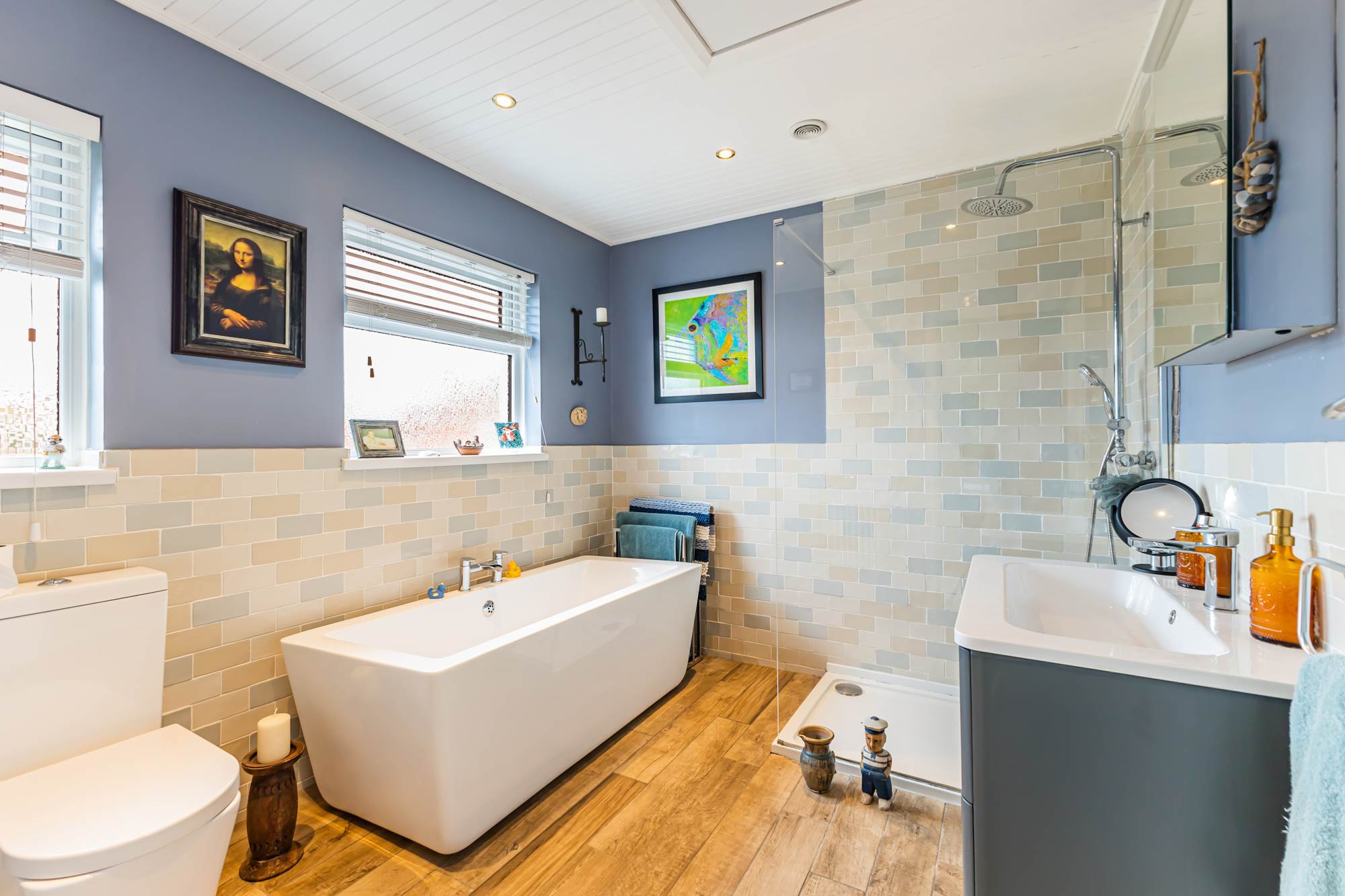 White suite comprising low flush wc with push button, wash hand basin with chrome mixer tap and vanity unit below. Heated towel rail, part tiled walls, tiled floor. Walk-in shower with drying area, fixed glass door, chrome thermostatic control valve and telephone hand shower and drencher shower head, pine tongue and groove ceiling, low voltage spotlights, extractor fan. Access hatch to roofspace via Slingsby type ladder.