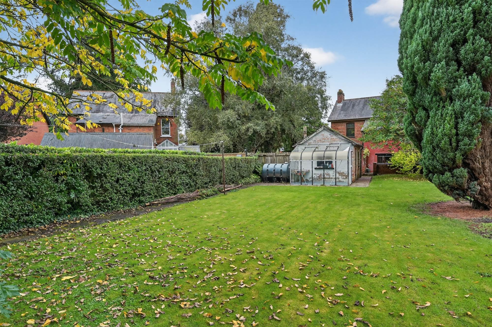 Enclosed front and rear gardens with maintained lawn, mature borders and shrubs, green house, driveway parking.