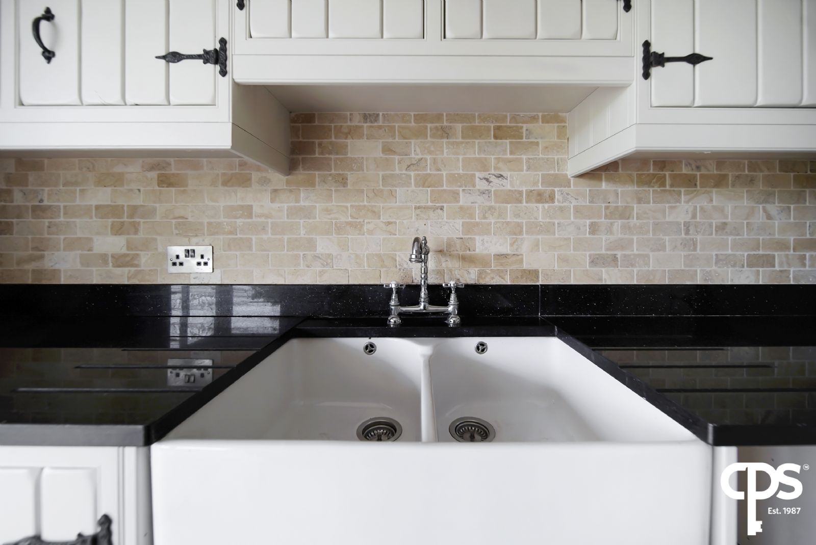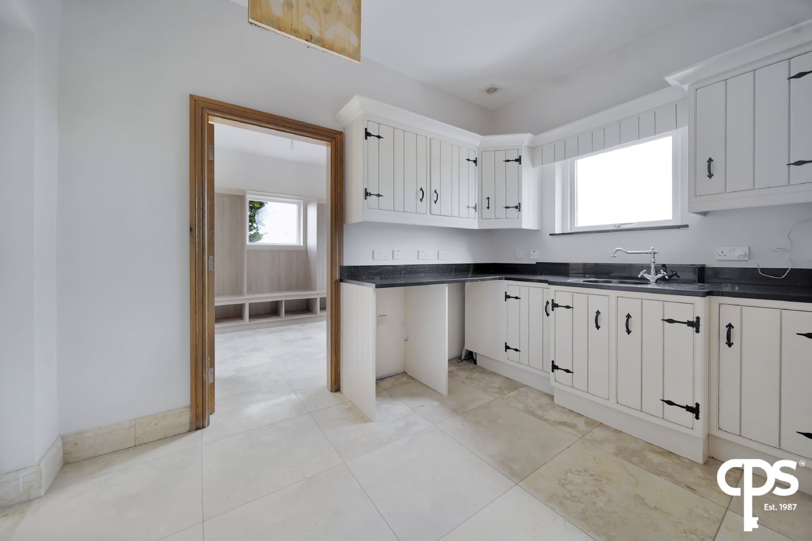 Just off the entrance hall through another set of glazed French doors; this fully fitted country style kitchen and dining room offers a beautiful space for family living. The kitchen has ample storage with high- and low-level units, a black granite worktop, a feature island, a double Belfast sink, and space for a range stove. The dining area benefits from fully glazed windows; bringing in ample natural light.