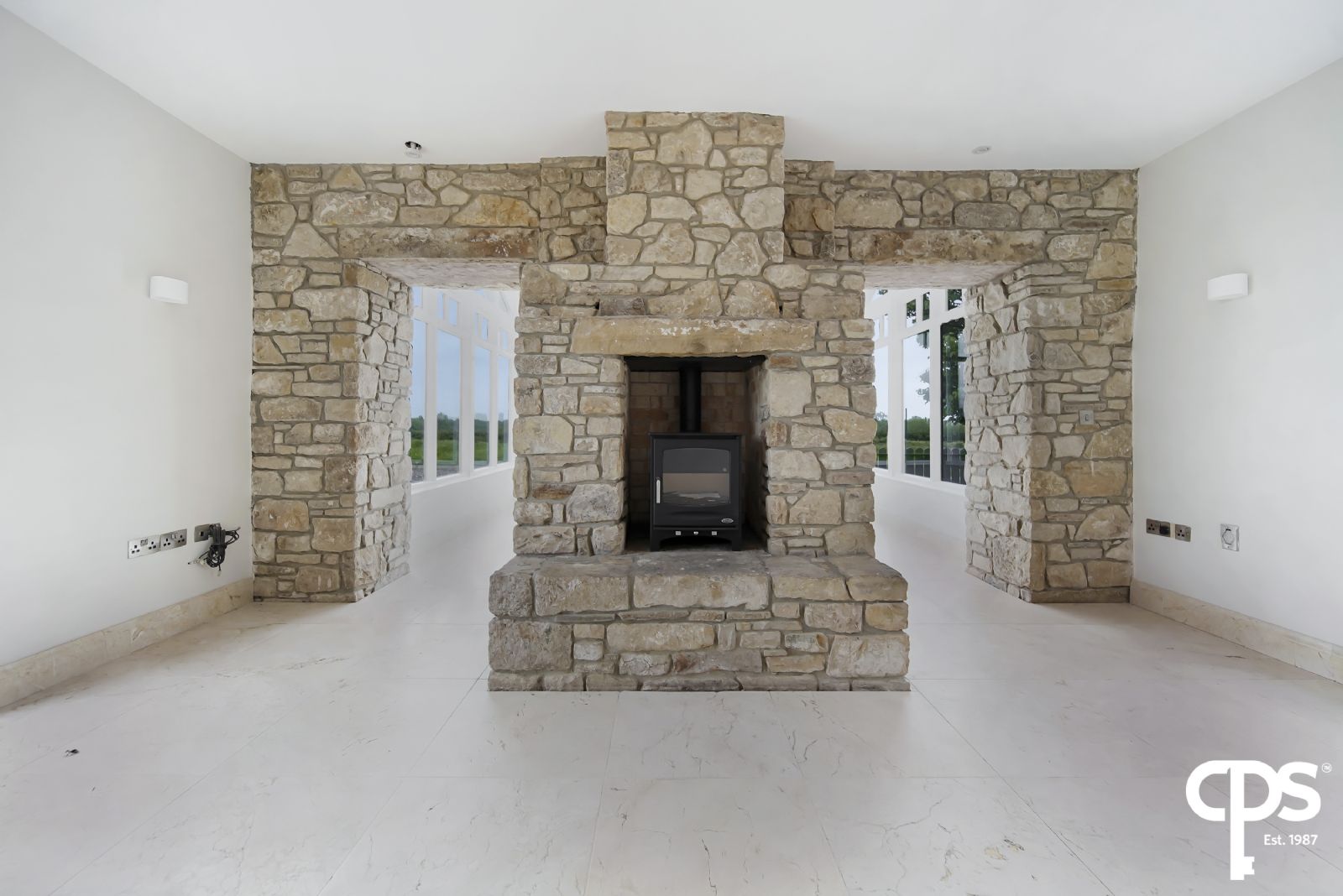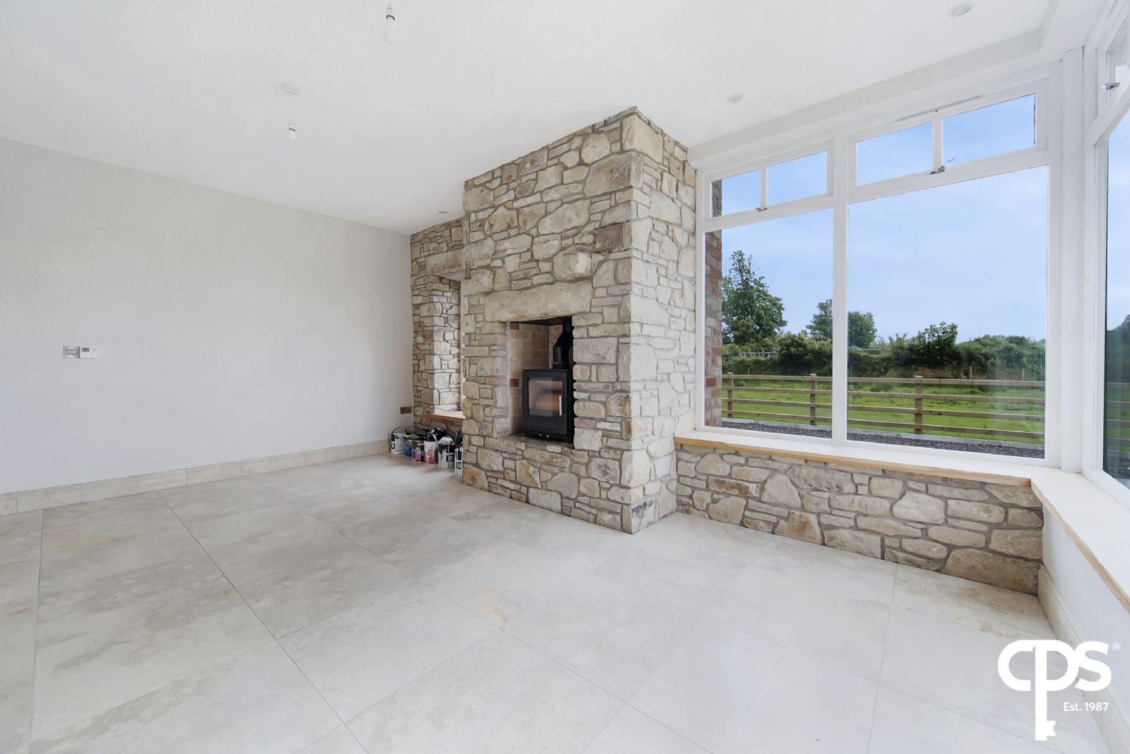 Next to the kitchen and dining room is the second reception room; which also features a beautiful stone wall and chimney breast with an open fire. The tiled flooring and skirting continue through this room; as well as a stunning corner window. spot lighting, and glazed French doors.