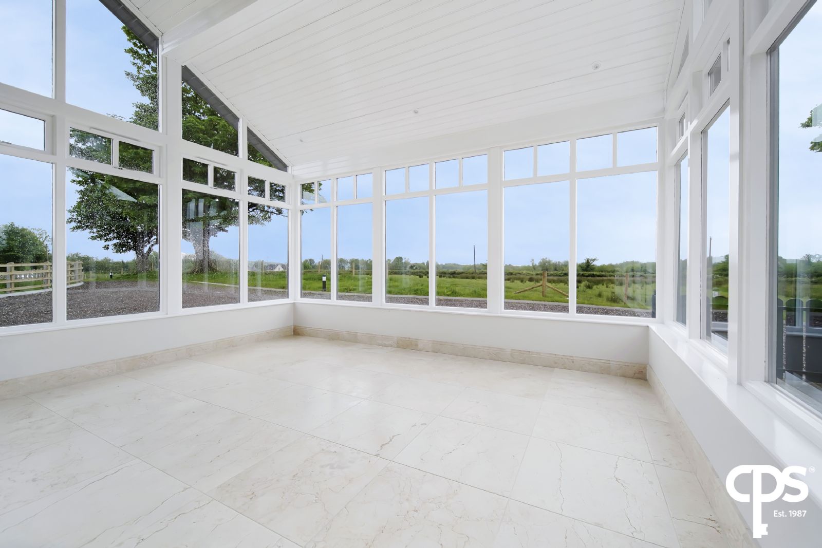 Accessed through the reception room; the sun room shares the same feature stone wall with wooden frame double glazed windows and a wooden panelling ceiling with spot lighting. The tiled flooring and skirting extend through to this room also.
