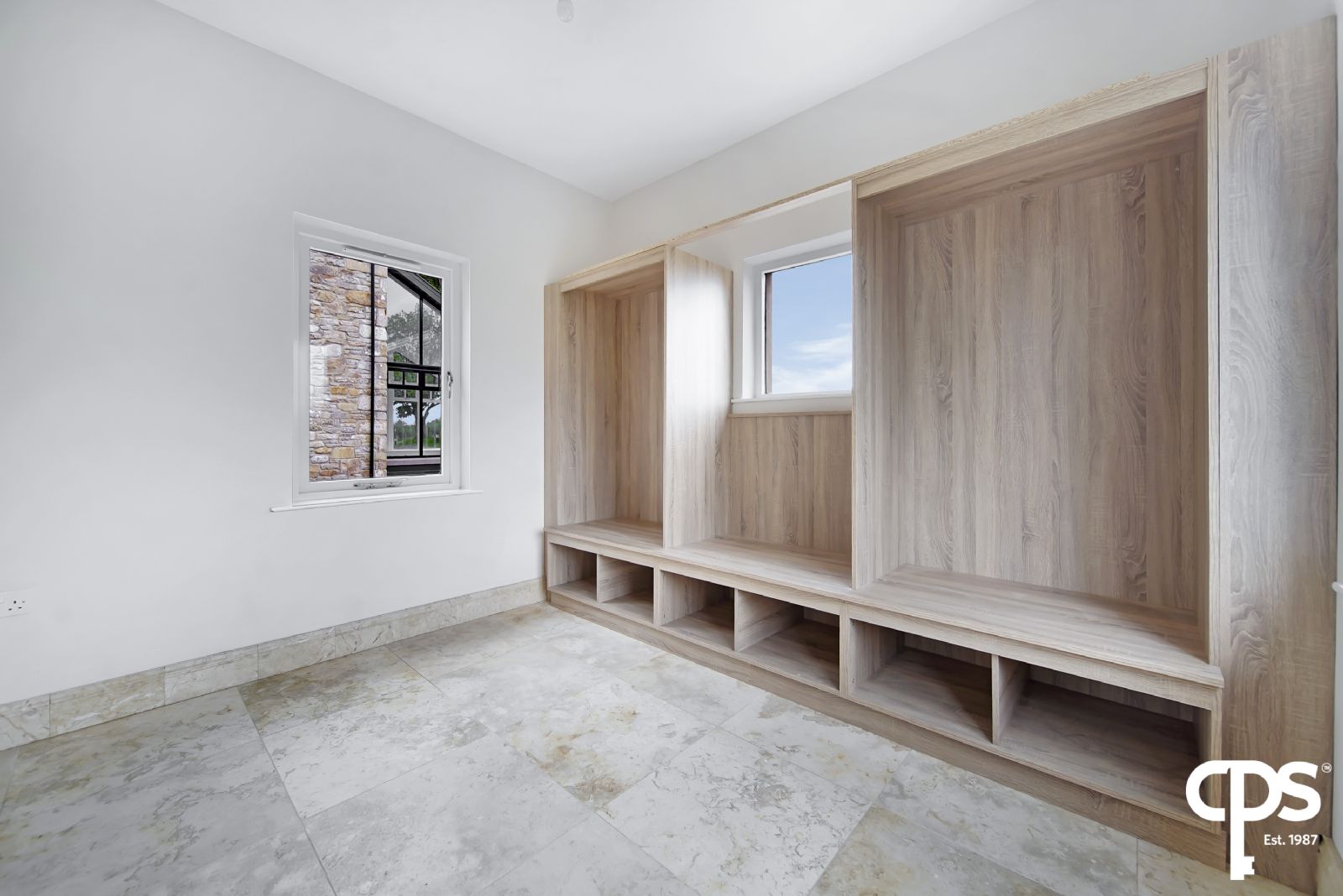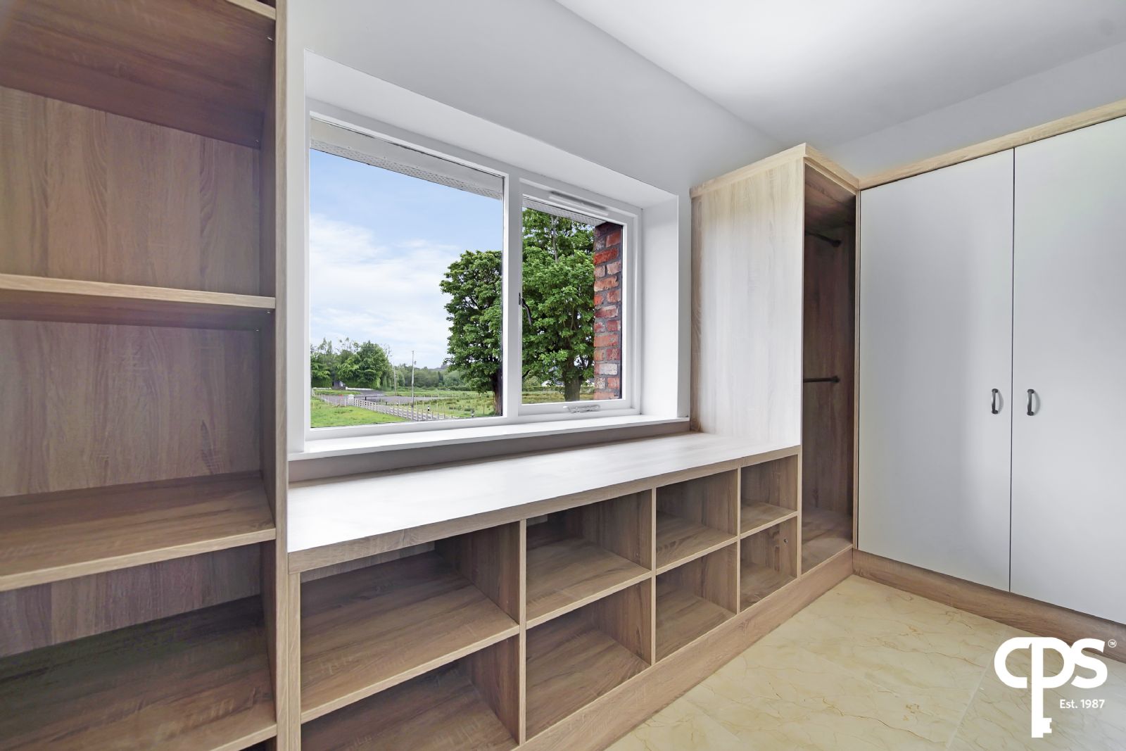 Ideal for all those clothes and shoes; this great dressing room offers various shelving and cupboard space with tiled flooring and a wooden frame double glazed window.