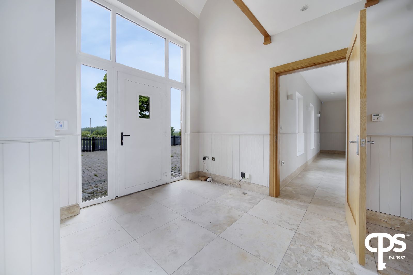 The entrance hall is accessed through a PVC door with a double glazed inset and a glazed surround; which allows the natural light to enter and create this bright and spacious entrance. This space features two structural columns, wooden wall panelling, spot lighting, and floor lighting. The security alarm panel is located at the front door and access to the beautiful open oak staircase.