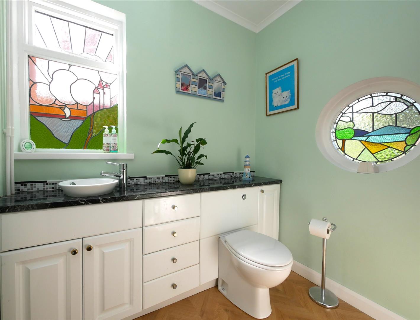Ground floor w.c comprising of low flush w.c, wash hand basin with stainless steel mixer taps and a selection of lower level units with stone effect countertops. Original stained glass windows. Laminate flooring.