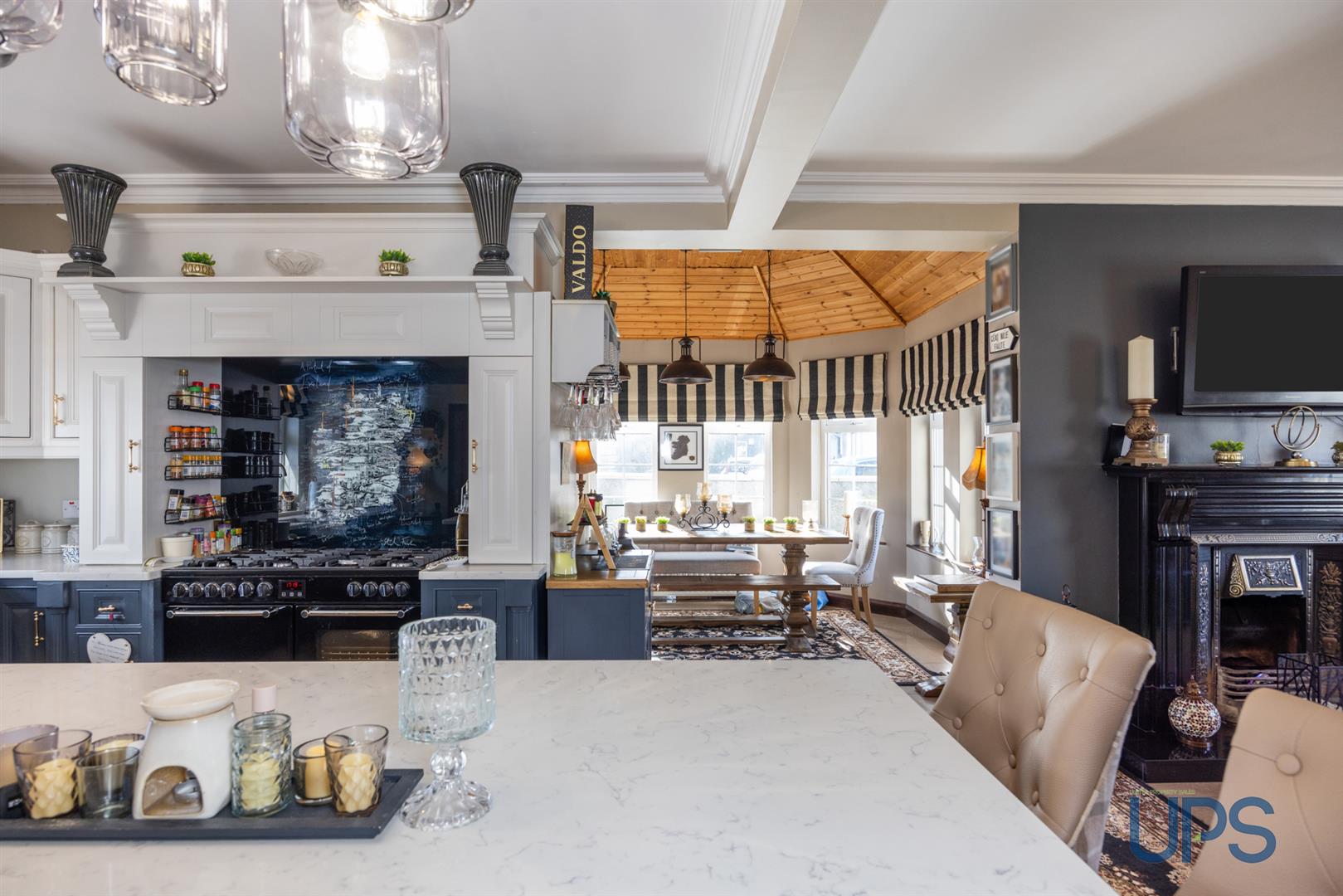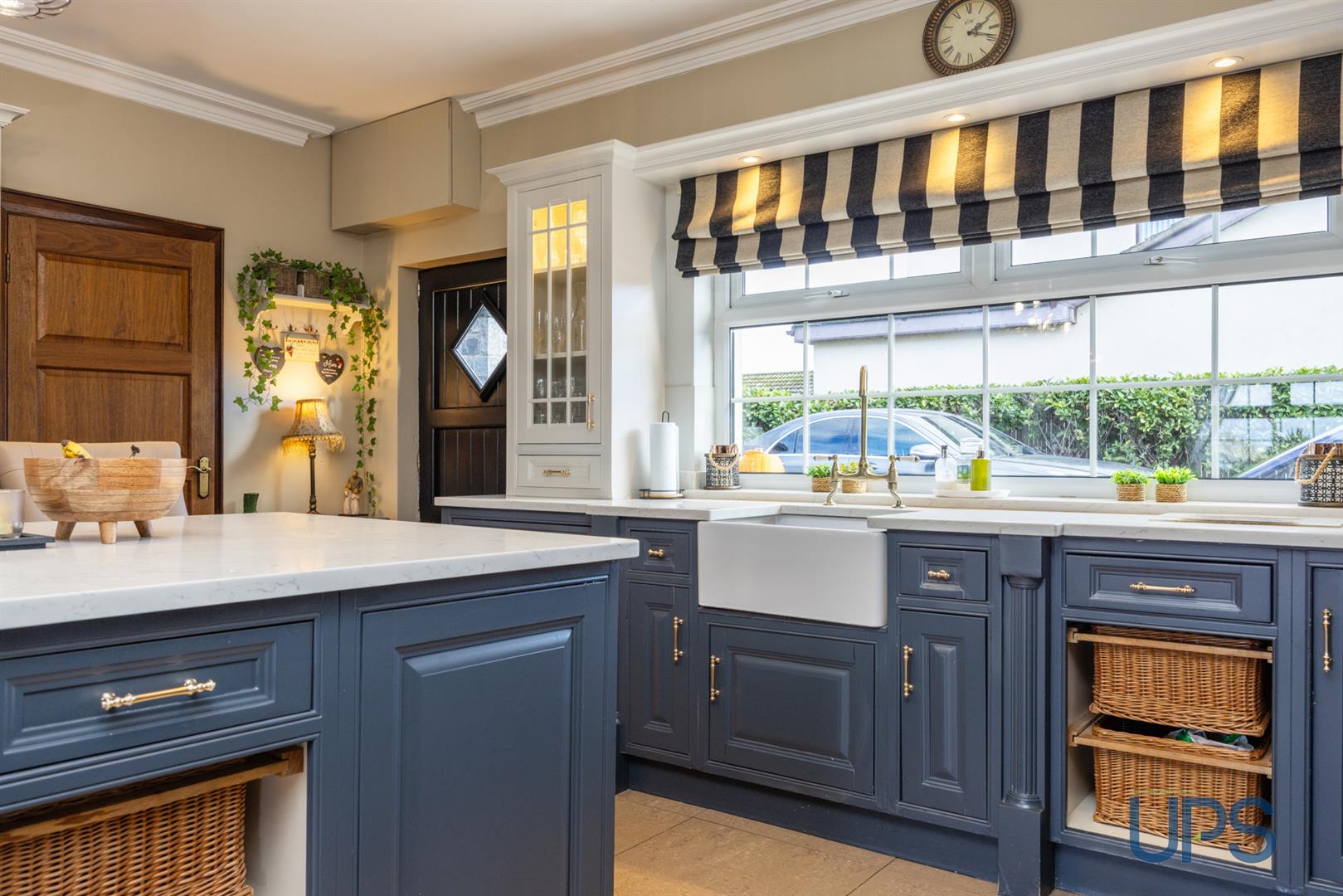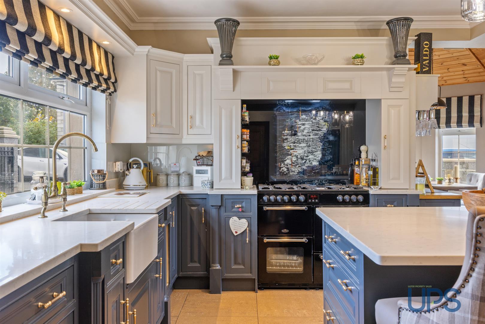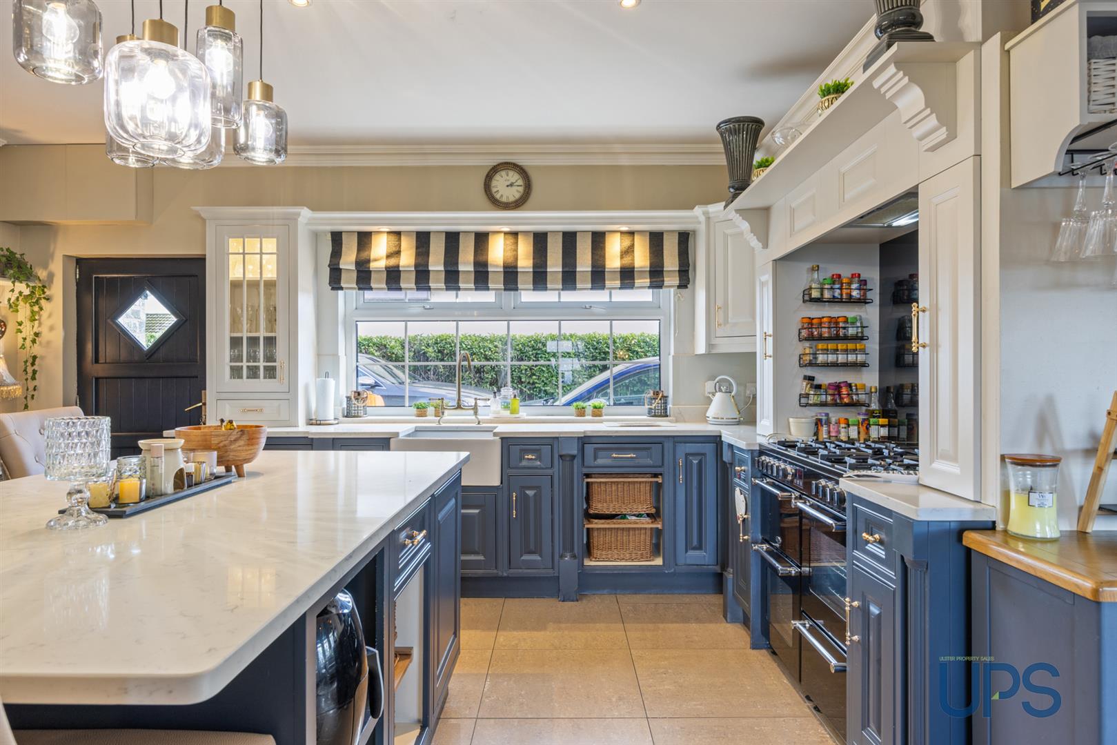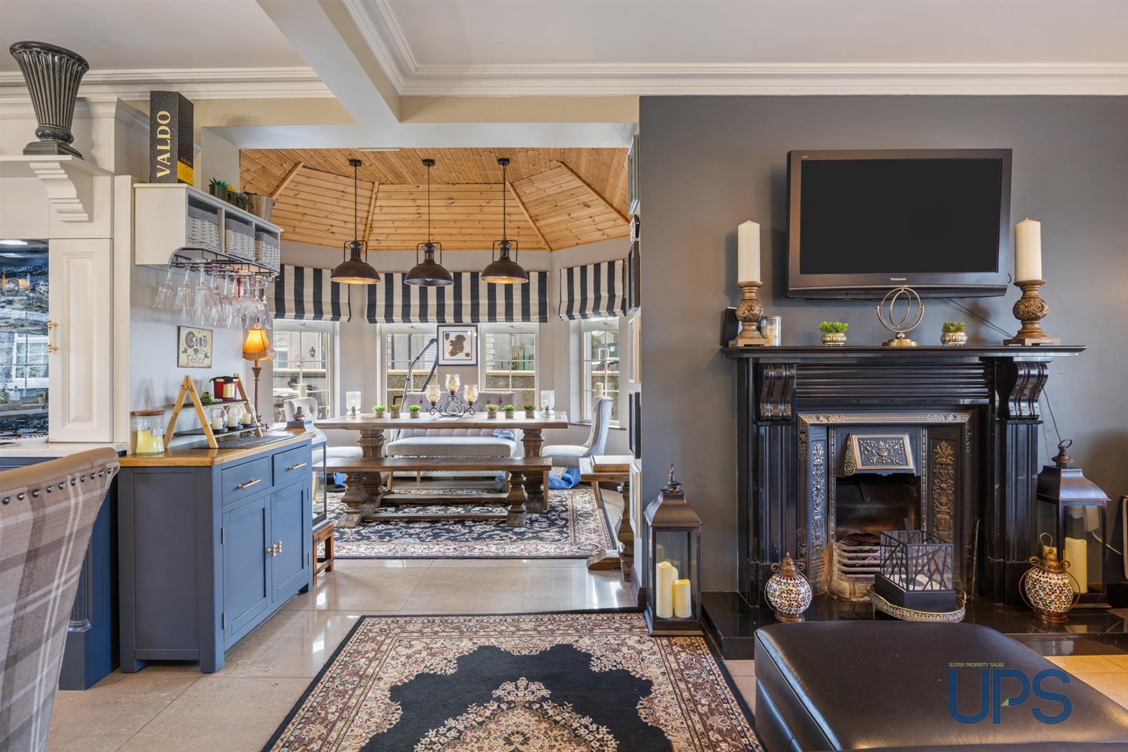 A superb entertaining space featuring a beautiful tiled floor and an attractive fireplace with a cosy open fire, complemented by stunning views of the lough. Open plan to a high-quality luxury fitted kitchen and dining area with a range of high and low-level units, Belfast-style sink, Quartz worktops, and a feature island offering ample seating. Additional features include an extractor canopy, elegant cornicing, spotlights, and access to: