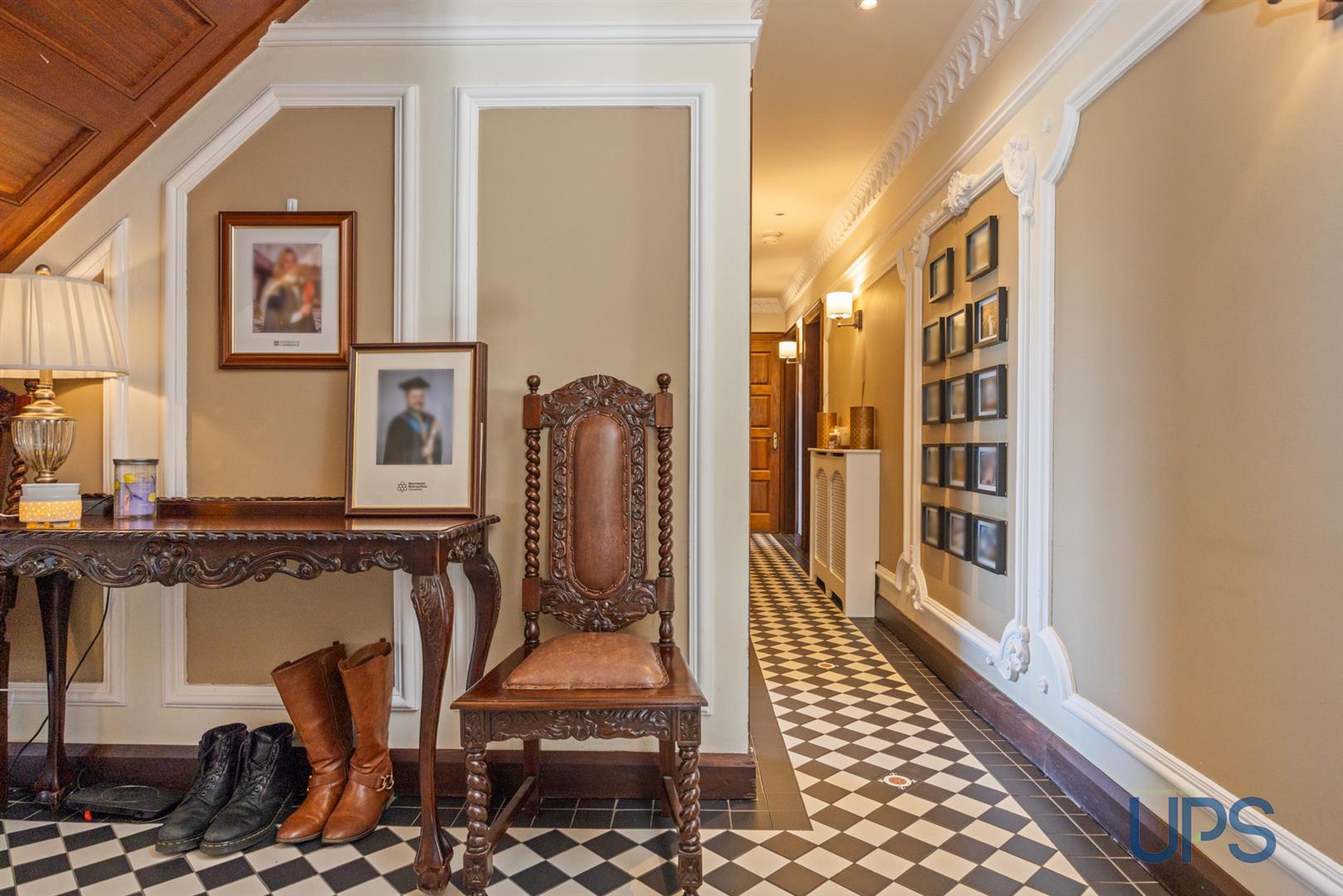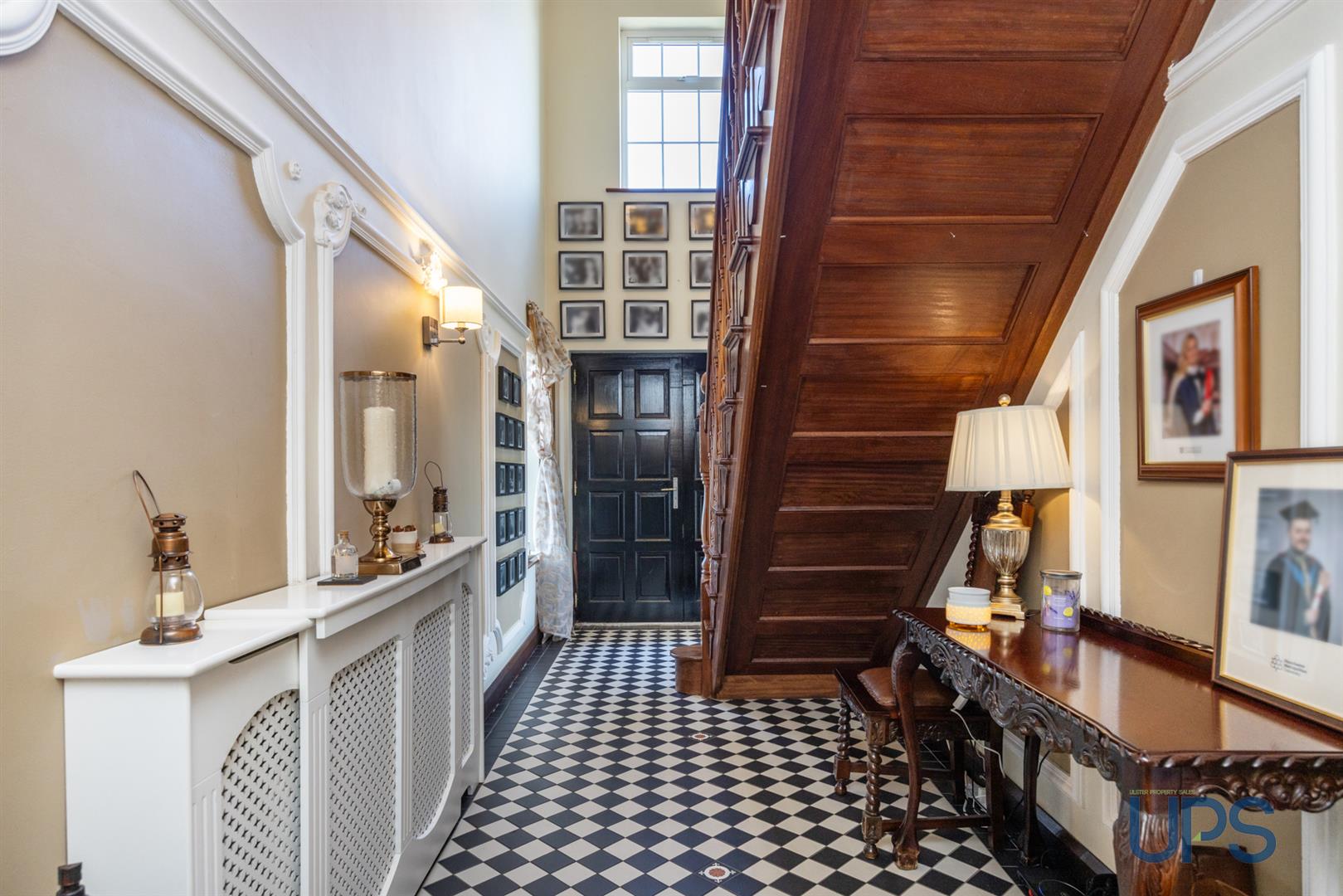 A pair of elegant double doors open to an impressive and grand entrance hall, showcasing an eye-catching vaulted ceiling, beautifully tiled flooring, and detailed high-quality cornicing.
