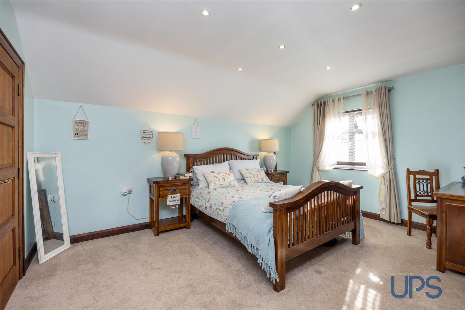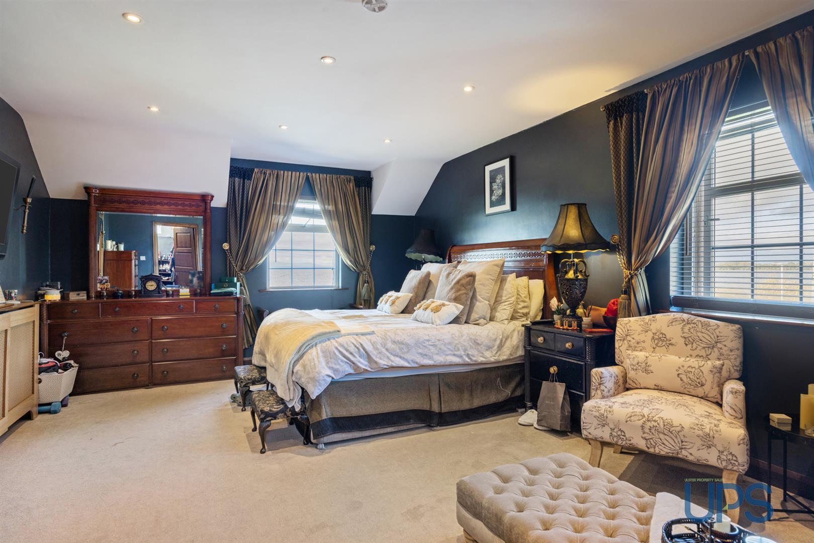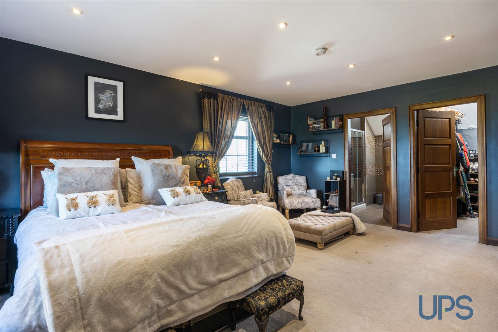 A most impressive principal suite featuring spotlights and beautiful views, with access to a private ensuite dressing room and a luxurious ensuite shower room. The shower room comprises a large shower cubicle with body jets and rainfall shower head, wash hand basin, low-flush W.C., chrome-effect sanitary ware, chrome-effect towel warmer, contemporary tiled walls and floor, spotlights, and extractor fan.
