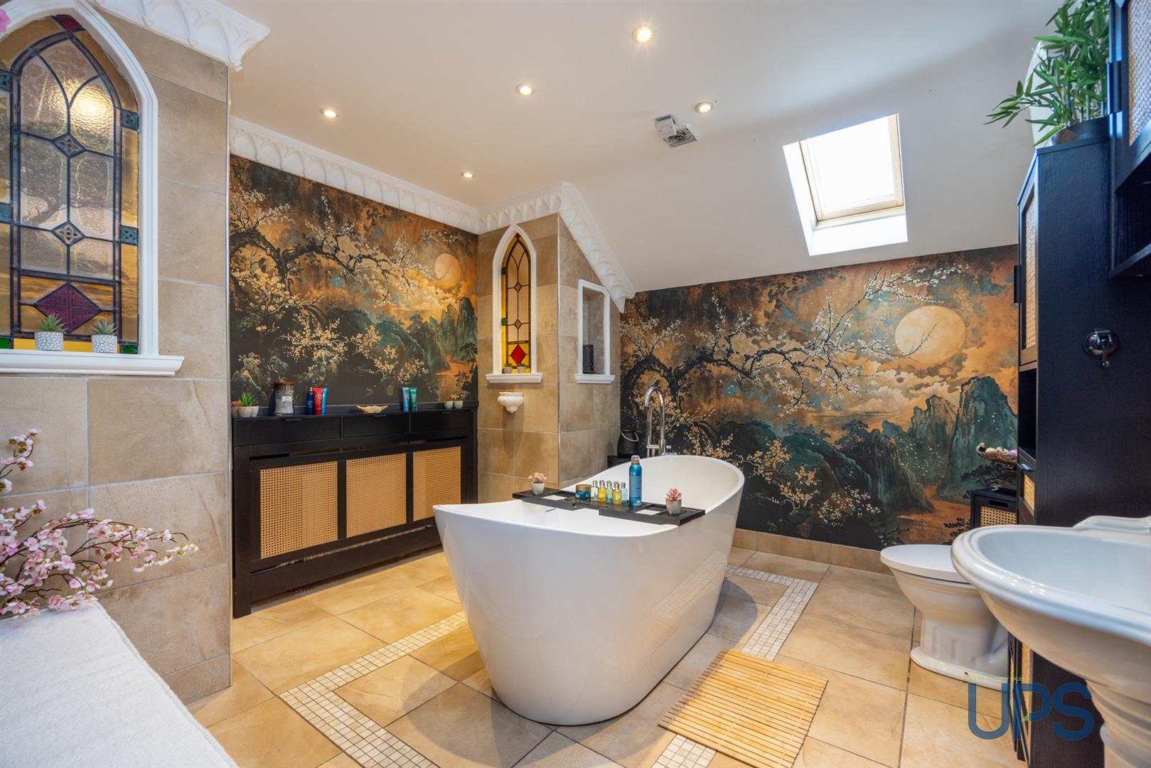 An eye-catching and unique white bathroom suite featuring a stunning free-standing bath with matching free-standing taps, pedestal wash hand basin, and high-flush W.C. The space is enhanced by high-quality cornicing, spotlights, tiled floor and partially tiled walls. Beautiful old church-style windows with coloured glass create a charming and tranquil atmosphere. Finished with high-quality sanitary ware throughout.