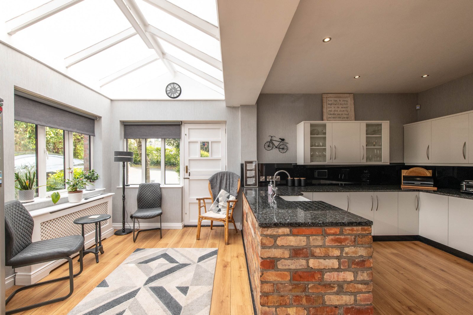 Range of units, plumbed for washing machine, sink unit, laminate wood flooring, casual dining area with uPVC door to rear