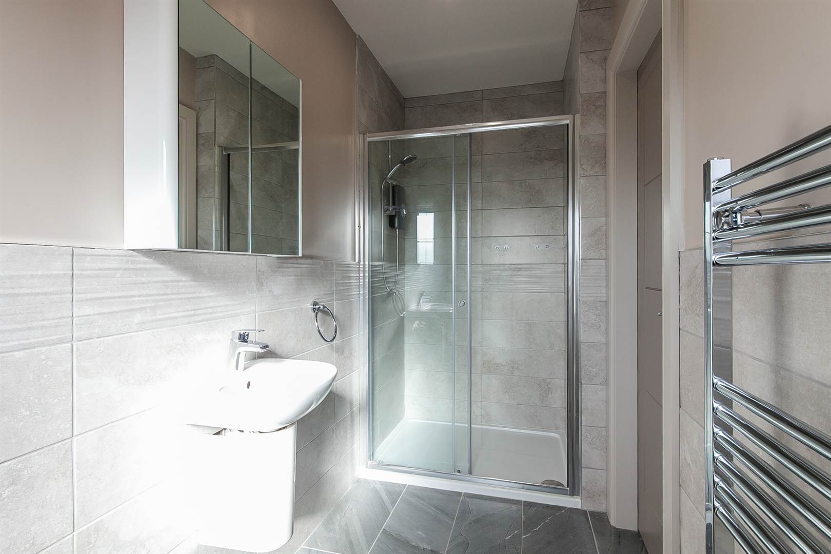 Double shower cubicle, electric shower, half pedestal wash hand basin, low flush wc, part tiled walls, ceramic tiled floor, wall hung mirror and medicine cabinet, chrome heated towel radiator, extractor fan, low voltage lighting.