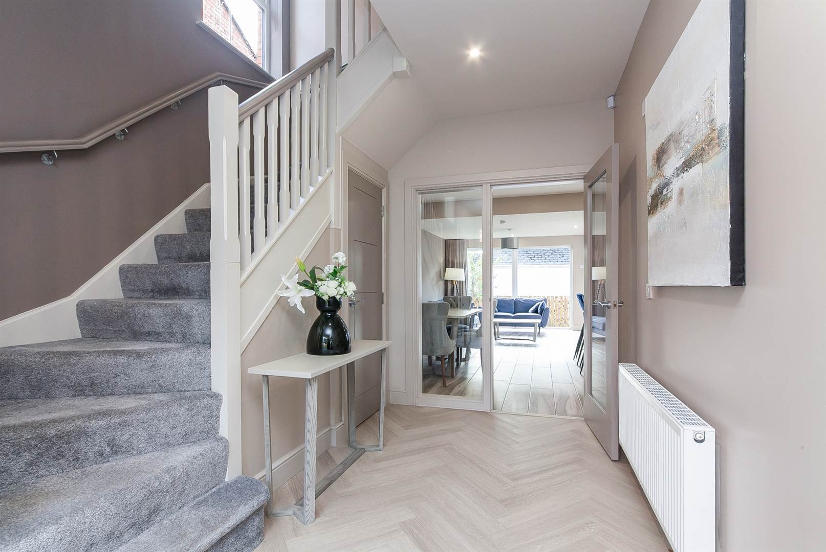 Staircase to the first floor with painted spindles and handrails, under stair storage, limed oak effect herringbone floor, low voltage lighting.