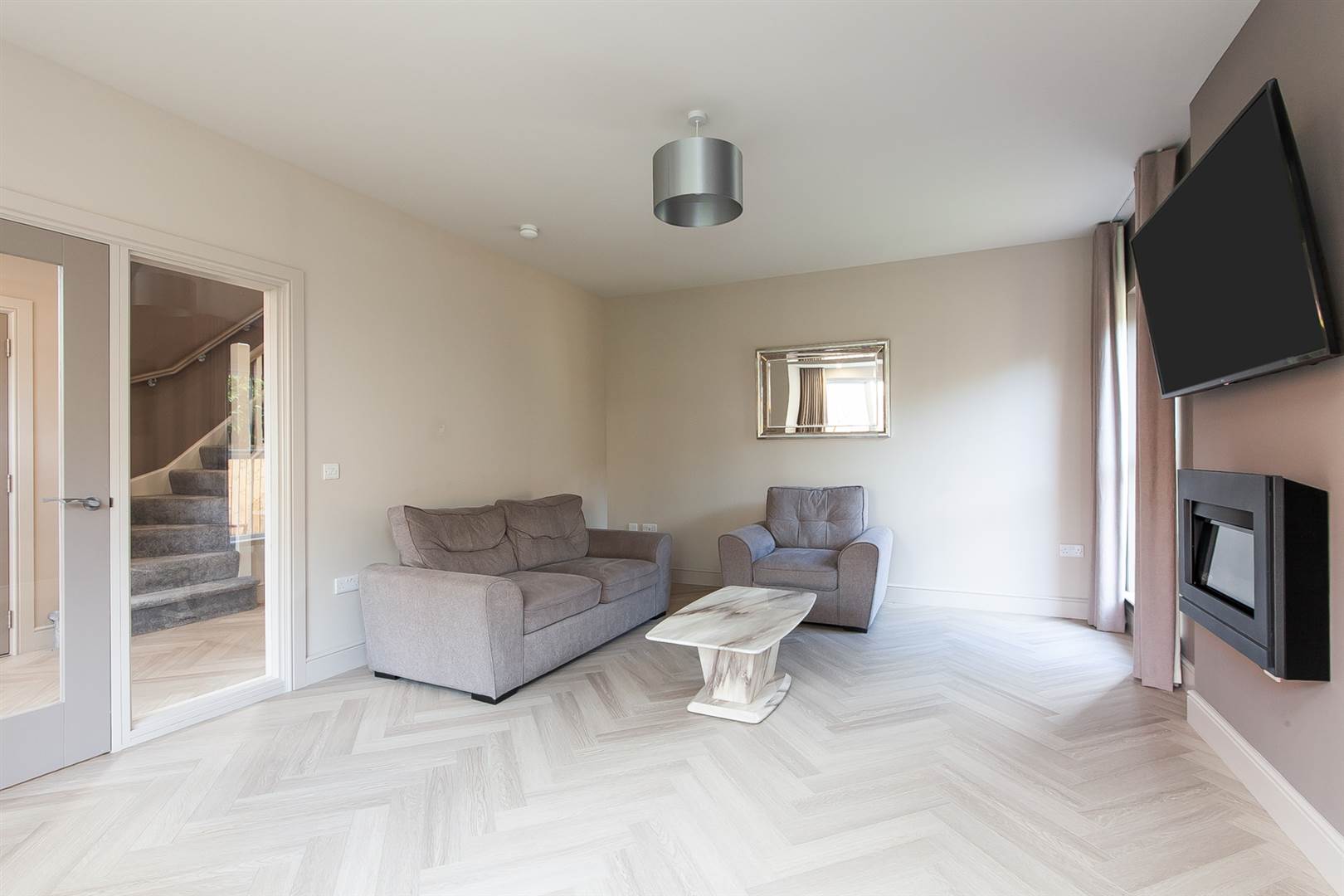 Wall mounted feature electric fire, low voltage lighting, limed oak effect floor in a herringbone style, solid door and side light to entrance hall.